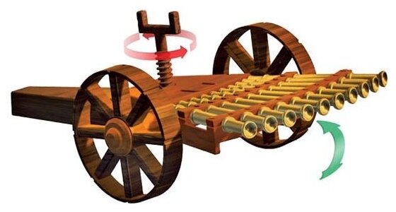 Леонардо модифицировал традиционную конструкцию пушки, сделав её 12 ствольной с механической регулировкой высоты стрельбы, что значительно повышало огневую мощь и устрашало армию неприятеля.