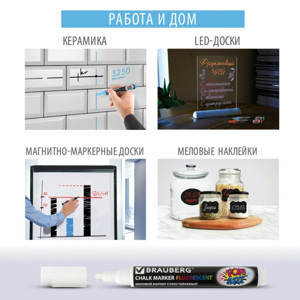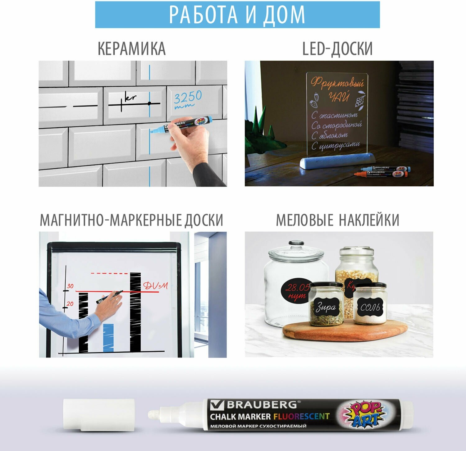 Сухостираемые меловые маркеры "POP-ART" - оригинальный инструмент для оформления различных зон помещений. Идеальны для использования на школьных занятиях и детского творчества.