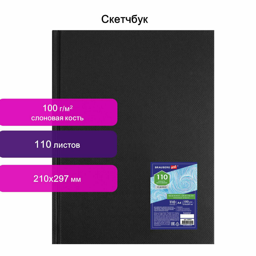 На сегодняшний день товар «Скетчбук Brauberg Art Classic слоновая кость 210х297 мм 110 л. Art Classic Блокнот-скетчбук (кремовая бумага) А4 110 листов» можно купить с кешбеком в 1 магазине: Яндекс.Маркет