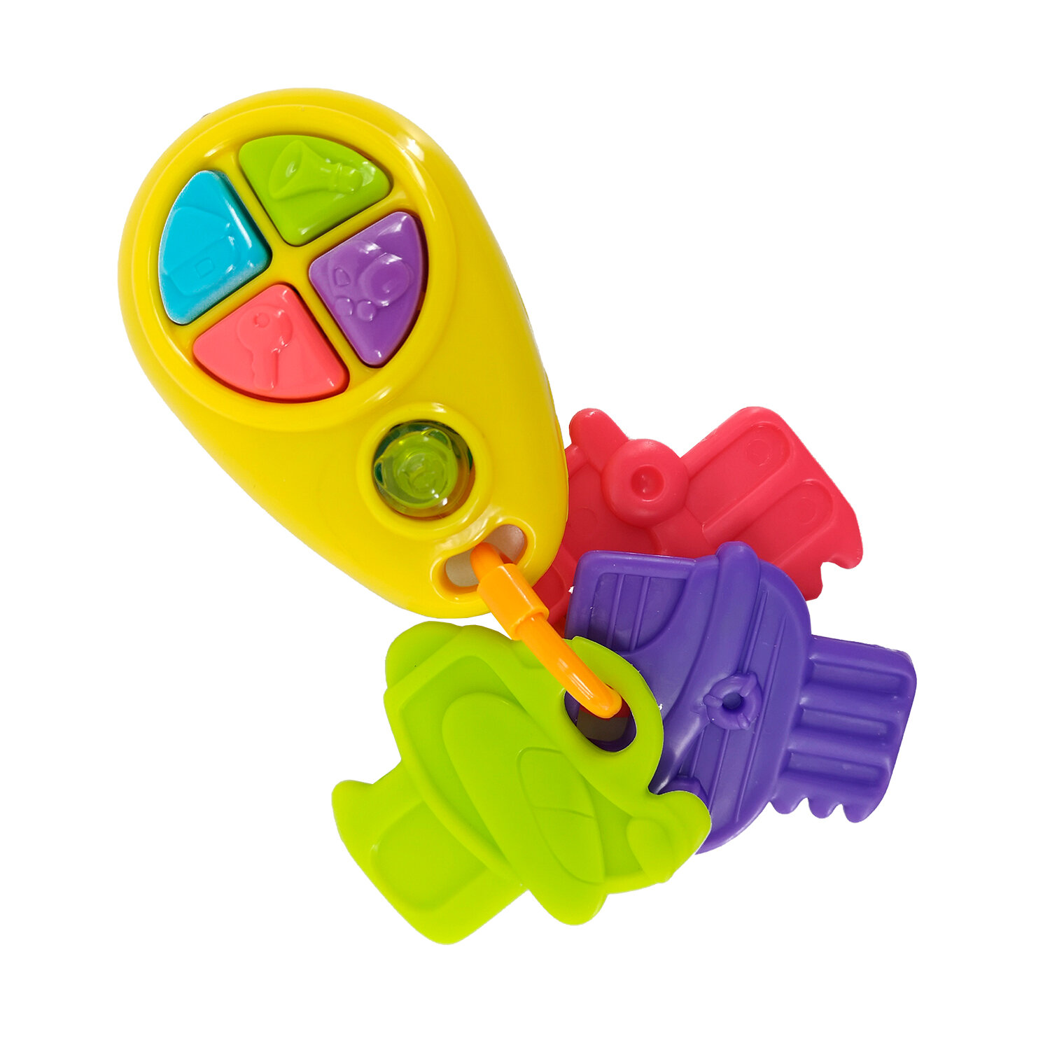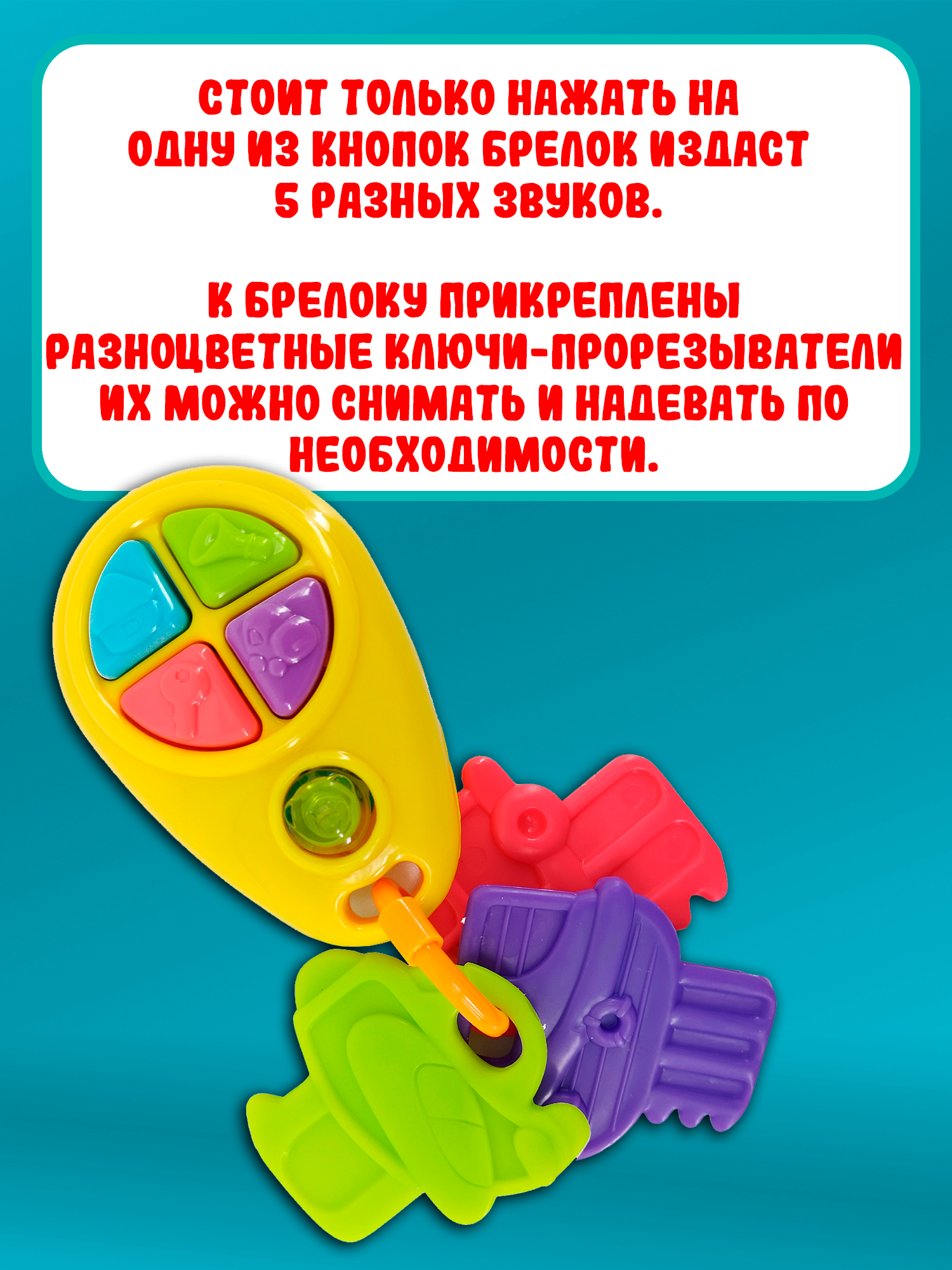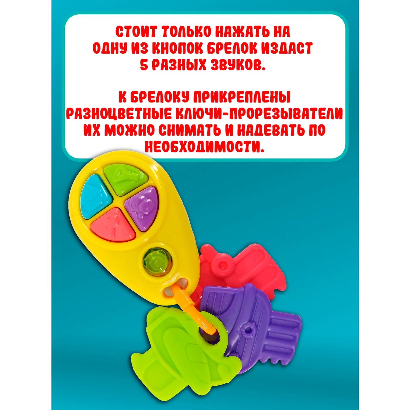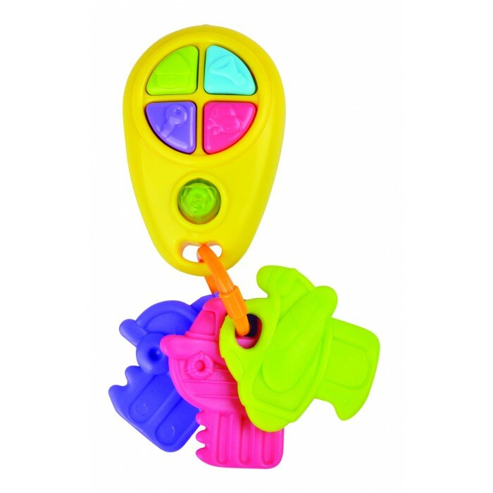 Веселая яркая игрушка выглядит, как автомобильный брелок, на котором висят три разноцветных ключика. Малыш будет в восторге от забавных звуков, которые издает игрушка, если нажать на кнопочки на брелке. Ключики можно перебирать пальчиками, трясти или грызть, когда режутся зубки.