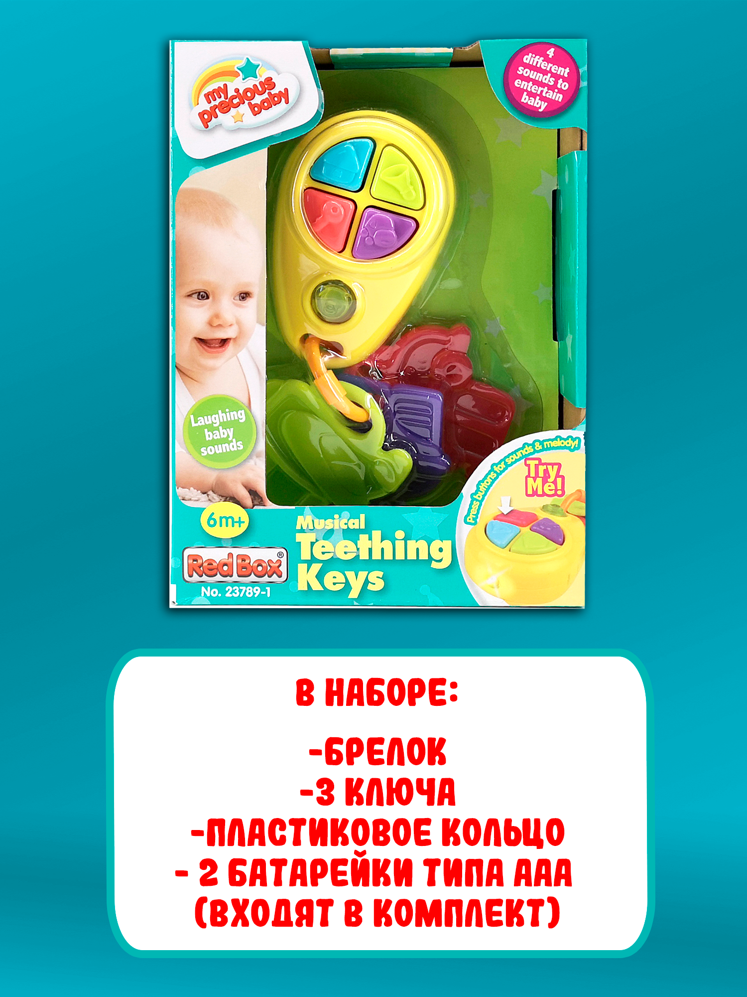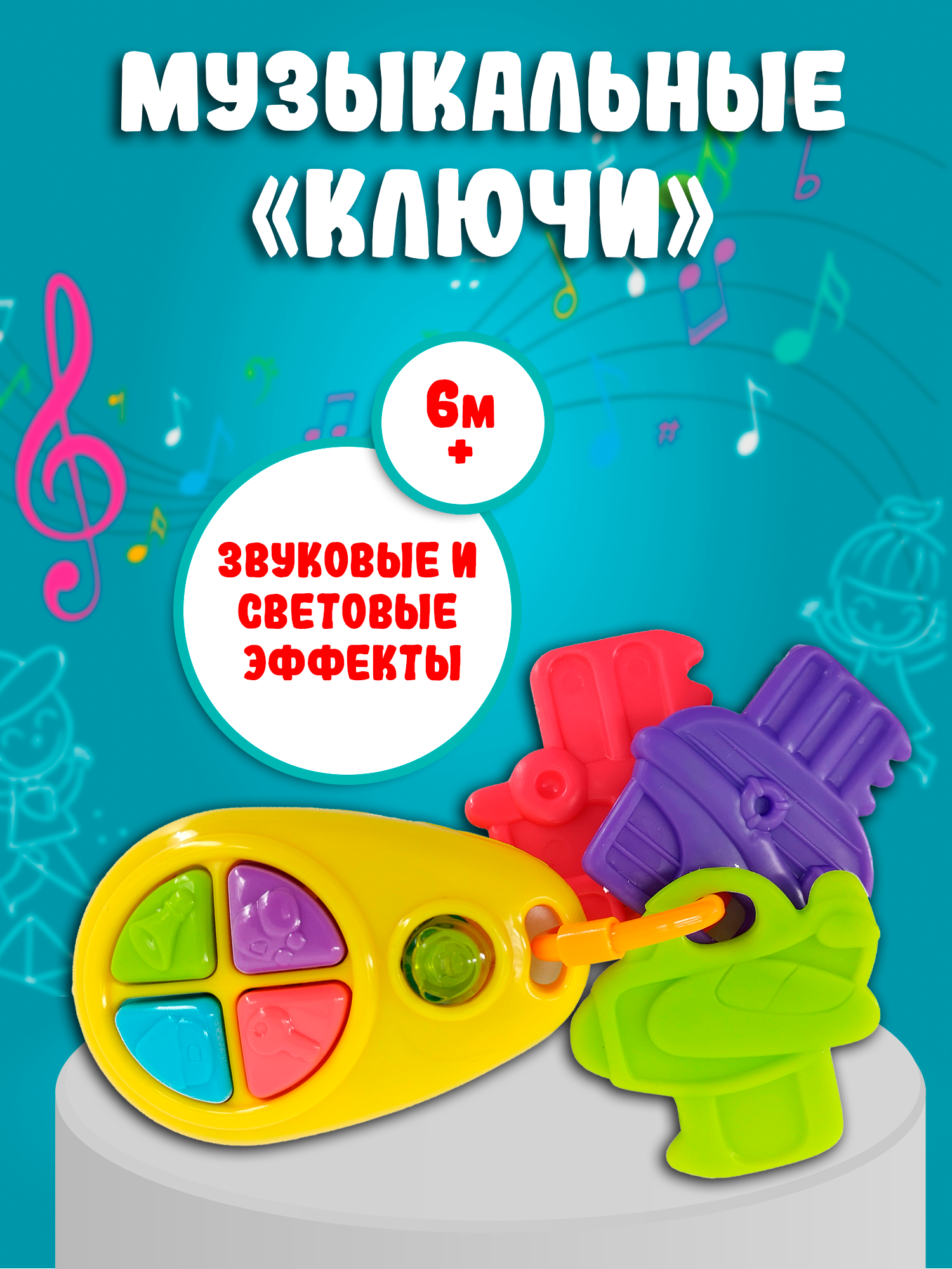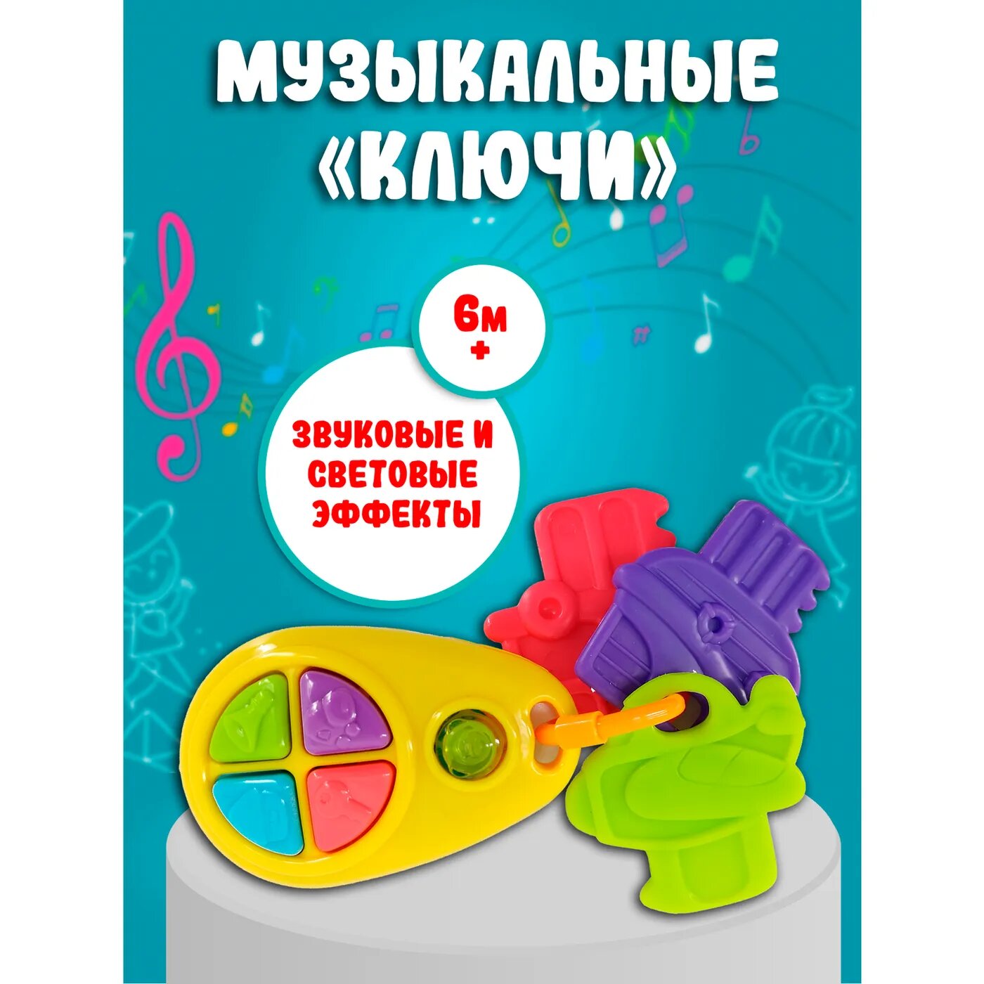 Веселая яркая игрушка выглядит, как автомобильный брелок, на котором висят три разноцветных ключика. Малыш будет в восторге от забавных звуков, которые издает игрушка, если нажать на кнопочки на брелке. Ключики можно перебирать пальчиками, трясти или грызть, когда режутся зубки.