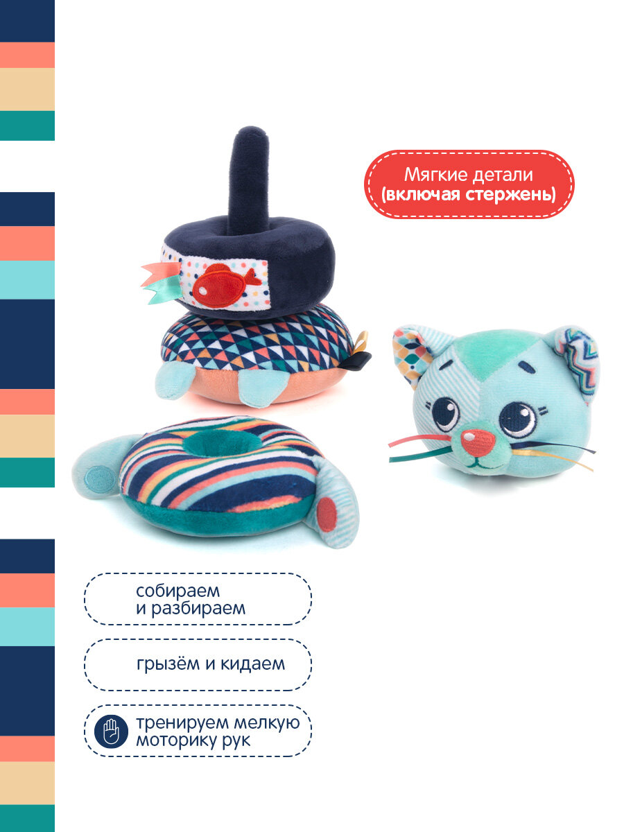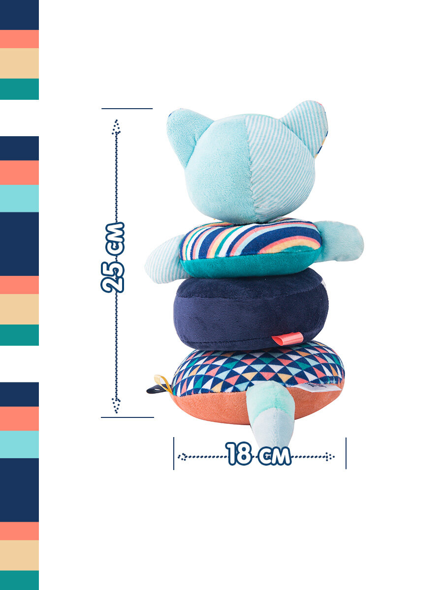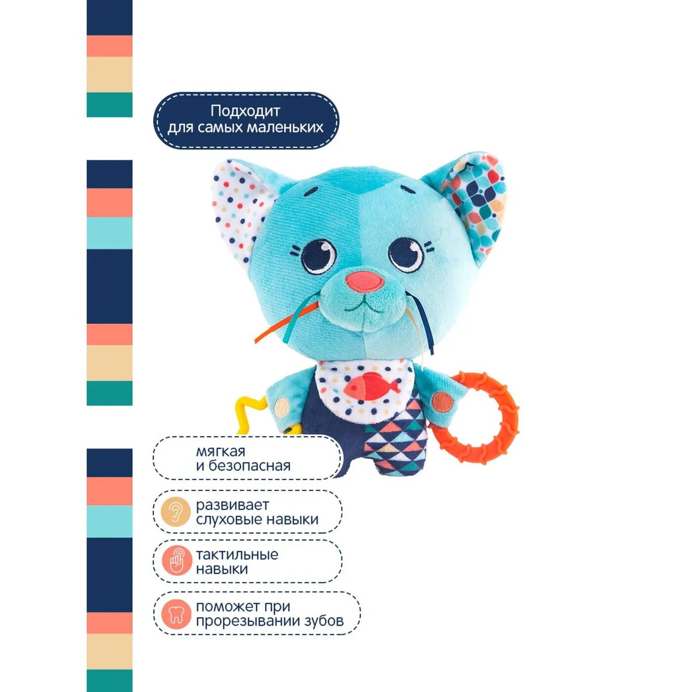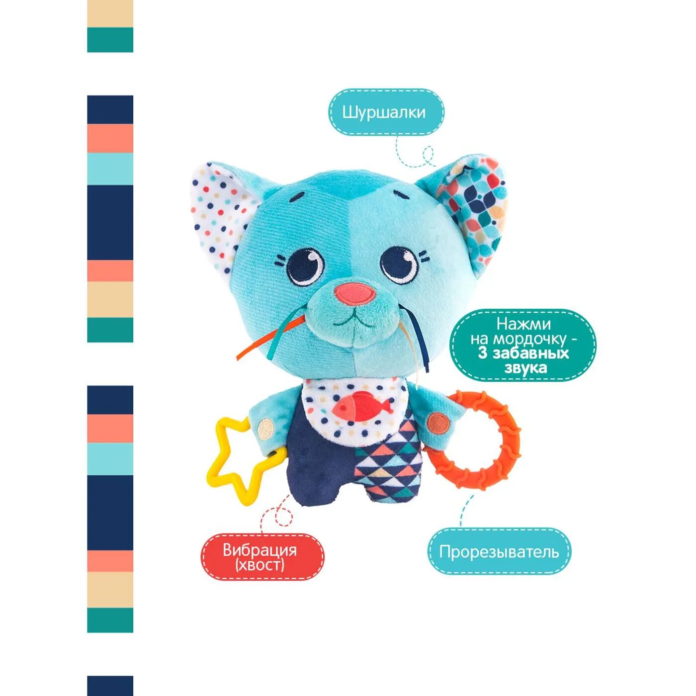 Музыкальная игрушка Котик Дарси с голубой мордочкой и разноцветными ушками и туловищем. Мордочка вышита нитками, усы сделаны из разноцветных ленточек. При нажатии на мордочку звучат 3 забавных звука, если потянуть за хвост, игрушка завибрирует. В лапки вшиты 2 прорезывателя разной формы (колечко и звездочка) с гладкой и рельефной поверхностями.