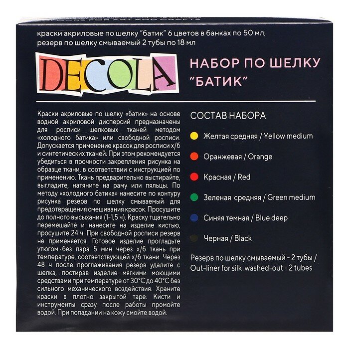 Акрил по шелку "Батик" 6 цветов+2 резерва Decola Акрил по шелку Батик 6 цветов по 50 мл