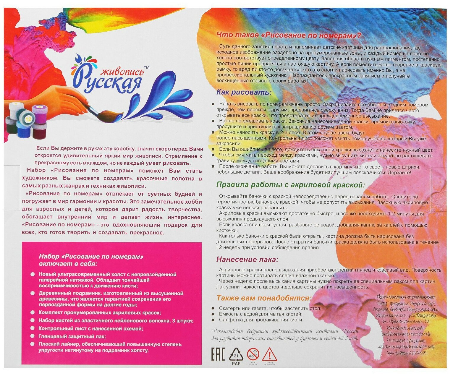 | Комплектация | холст; кисти; краски; контрольный лист; лак |