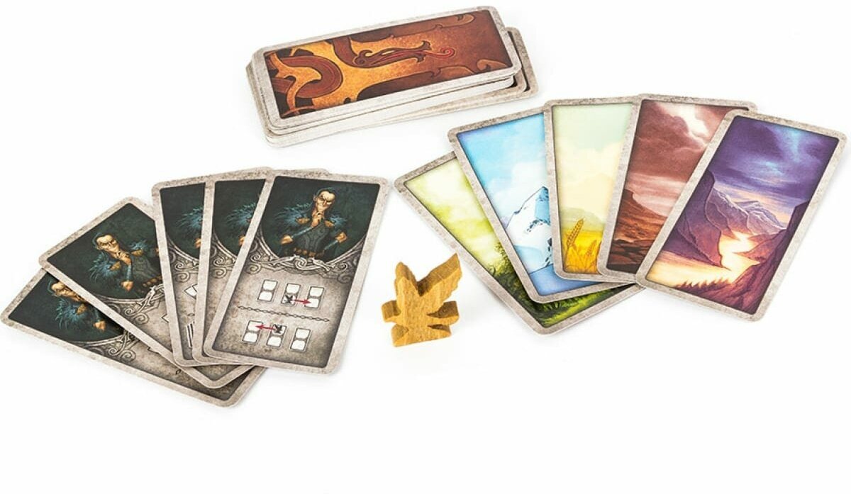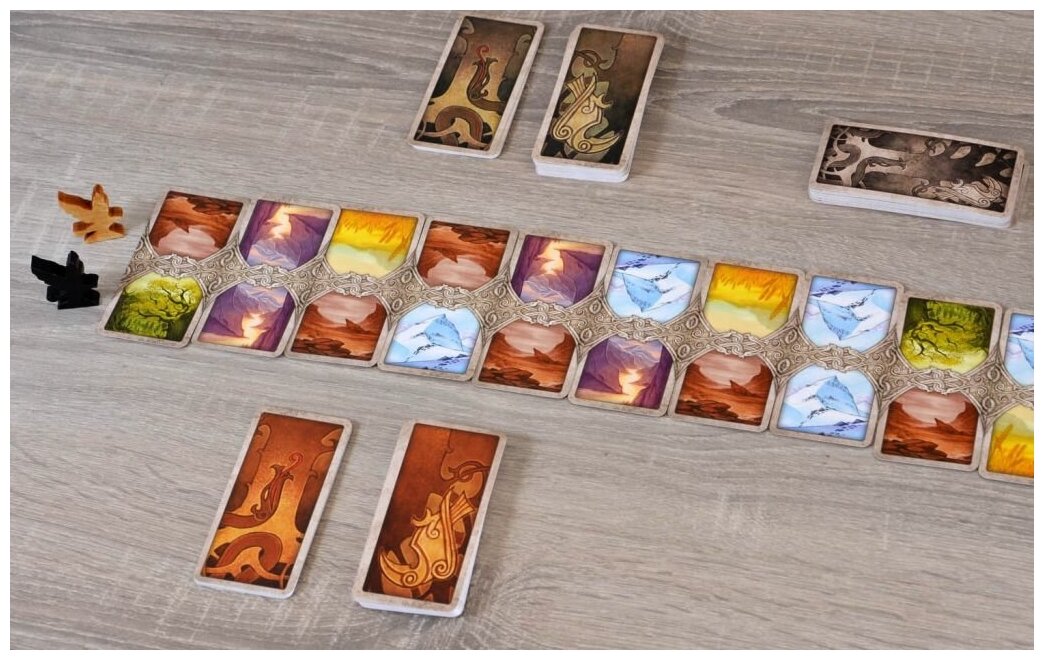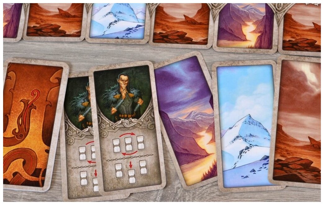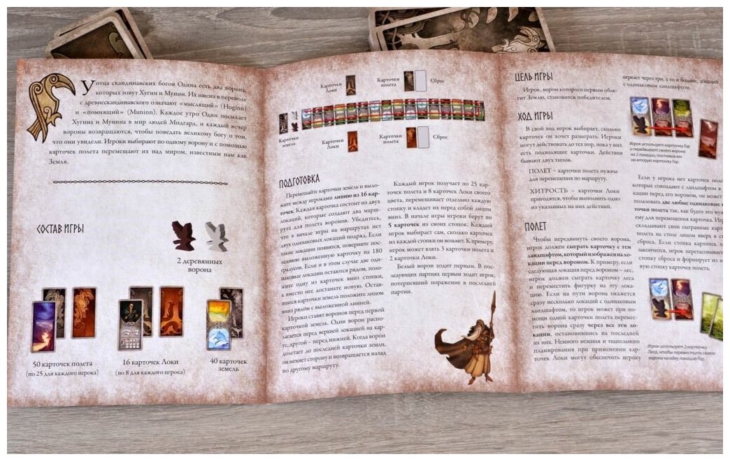 На стол выкладываются 16 карточек земель, причем эти карточки поделены на две локации, создавая тем самым два маршрута для каждого из воронов. Вороны полетят в противоположных направлениях, встретятся в пути и вернутся на стартовую карточку. Кто сделает это первым? Для передвижения ворона необходимо выложить подходящие карточки полета . Иногда можно попросить помощи у Локи, бога хитрости и обмана. Локи может упростить путь самому игроку или сделать сложнее путь его соперника! Задача игроков — правильно комбинировать карточки полета с карточками Локи, чтобы их вороны первыми вернулись с докладом к Одину.