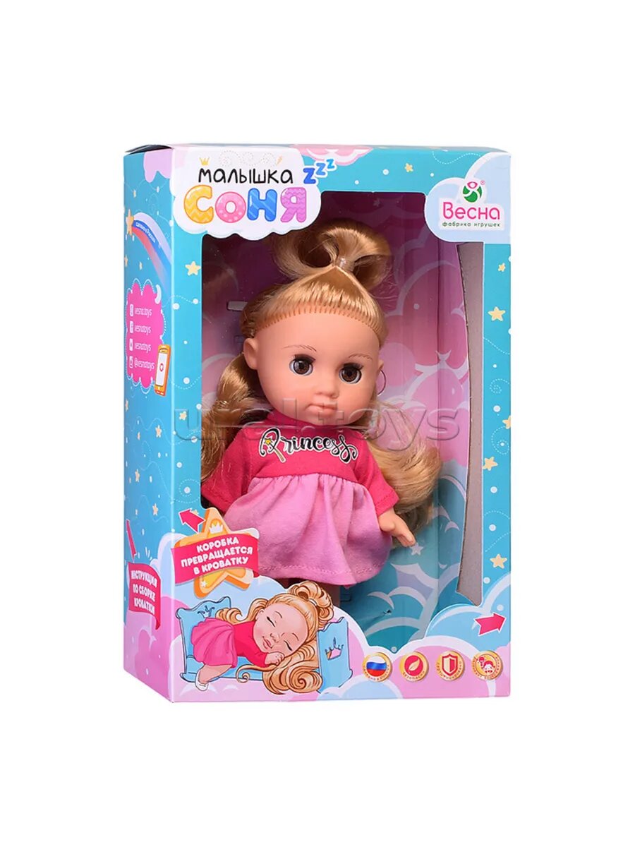 Малышка Соня Принцесса — это новый образ очаровательной куклы-малышки. Ее рост 22 см. У нее закрывающиеся глазки с пушистыми ресницами и длинные мягкие волосы.