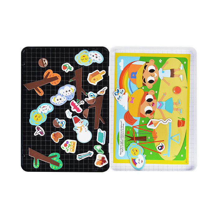 В него включены игра-ходилка вместе с магнитными переодеваниями, 20 интересных игровых заданий на тему Времена года и 40 магнитных элементов для их выполнения. Набор упакован в удобную металлическую коробку, которую можно взять с собой в любую поездку.