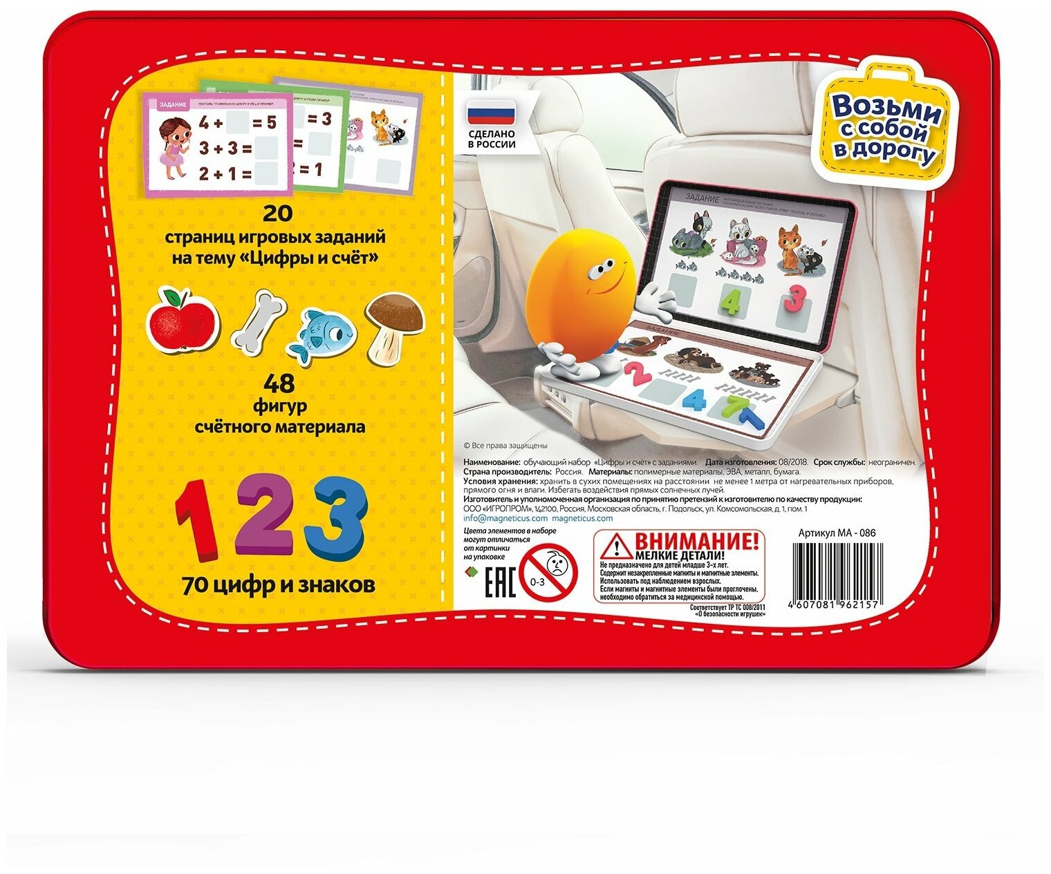 Для крепления магнитных цифр можно использовать любую металлическую поверхность, например, дверцу холодильника. Обучающая игра сложена в компактную металлическую коробку, которую удобно брать с собой в поездку или на прогулку. Также для крепления магнитных цифр можно использовать любую металлическую поверхность, например, дверцу холодильника или магнитную доску.