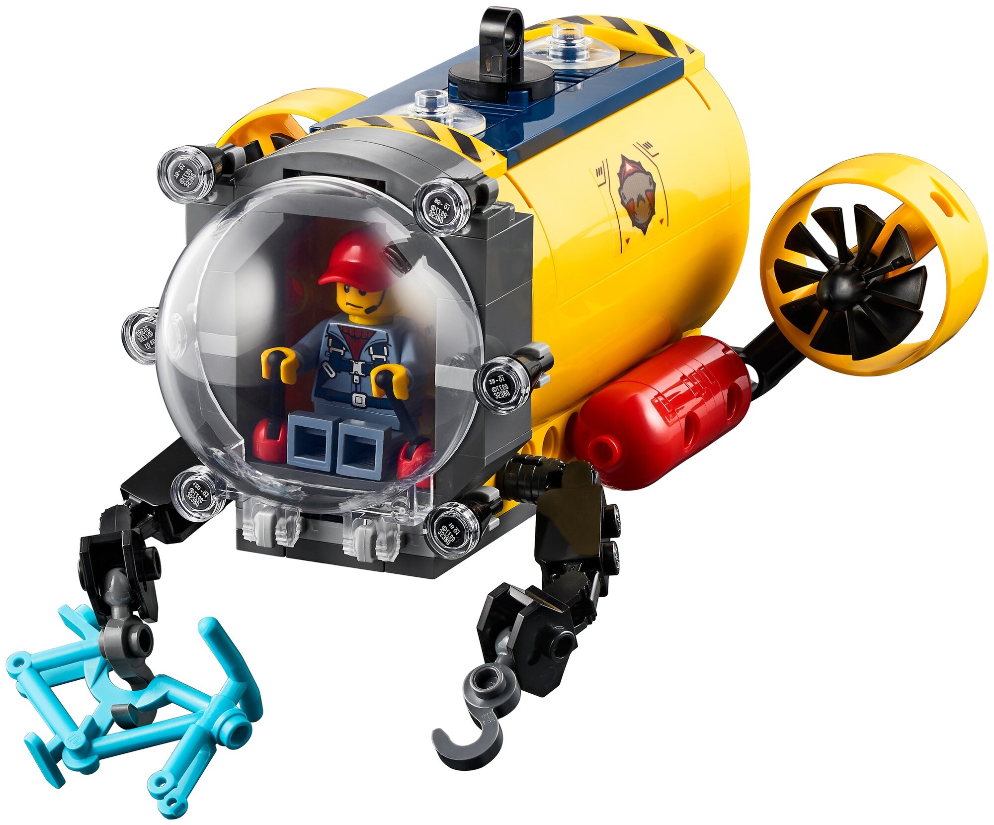 - подводный дрон оснащен двумя манипуляторами, подвижными винтами, внутри дрона размещается минифигурка
