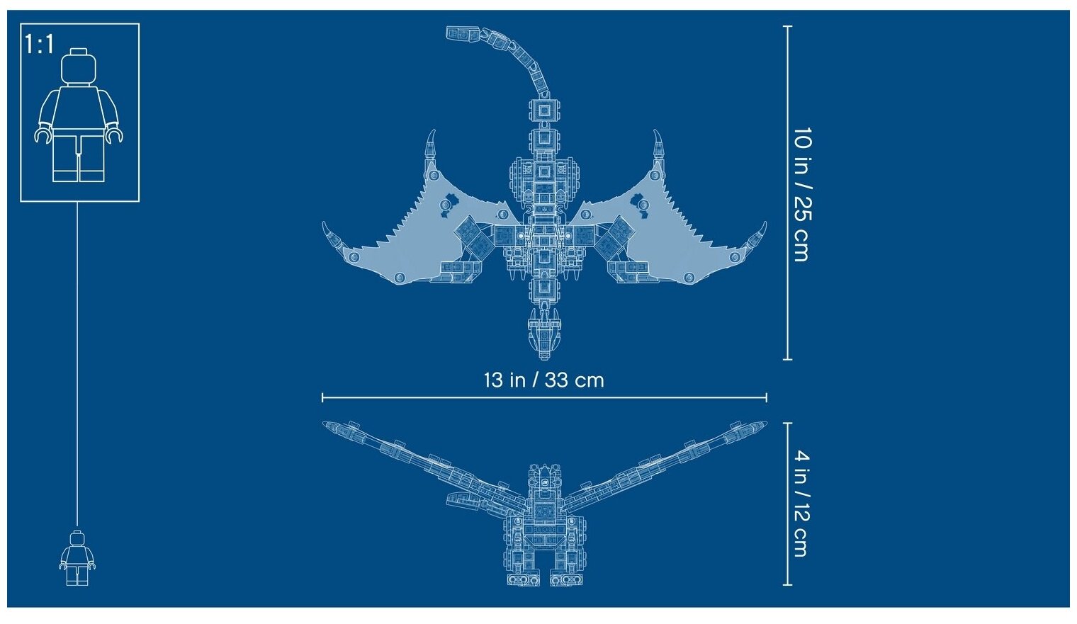 Этот дракон NINJAGO®, впервые выпущенный в июне 2020 года, достаточно компактен и подходит для игр как дома, так и в путешествии. Размеры дракона с расправленными крыльями — чуть более 12 см в высоту, 24 см в длину и 33 см в ширину. Для игр с этим набором не нужны батарейки, необходимо только детское воображение, поэтому дракон будет готов к увлекательным полётам, как только дети соберут его. Идеальный подарок LEGO® для маленького строителя. В набор входит буклет с понятными инструкциями, которые помогут детям самостоятельно собрать этого дракона и подготовить его к новым битвам.