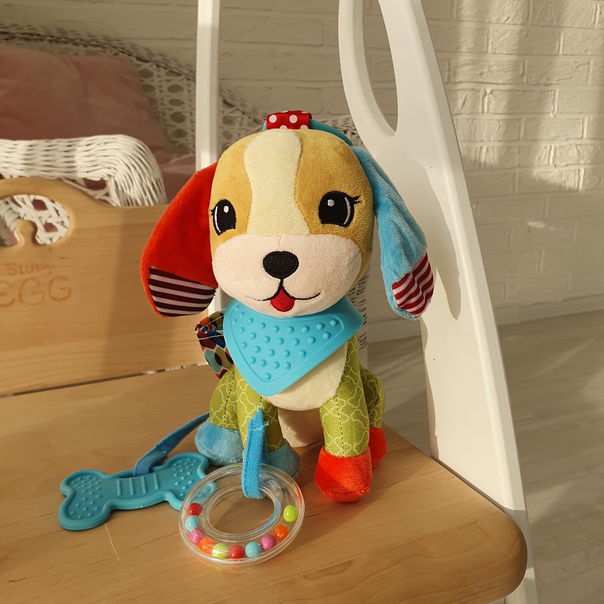 Изготовлена подвеска из тканей разного цвета и разной фактуры. Гладкие, плюшевые, хлопковые, атласные типы тканей были созданы специально для того, чтобы кроха развивал тактильные ощущения, слух и зрение. На спинке есть небольшой карман, который сохранит прорезыватель в чистоте.