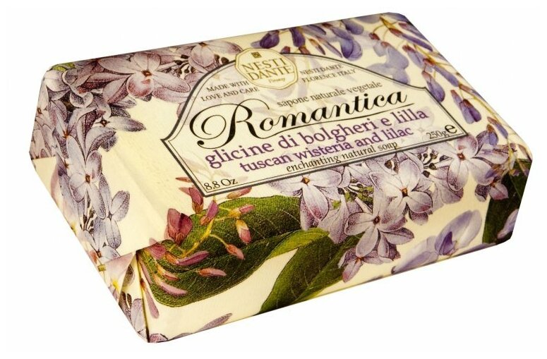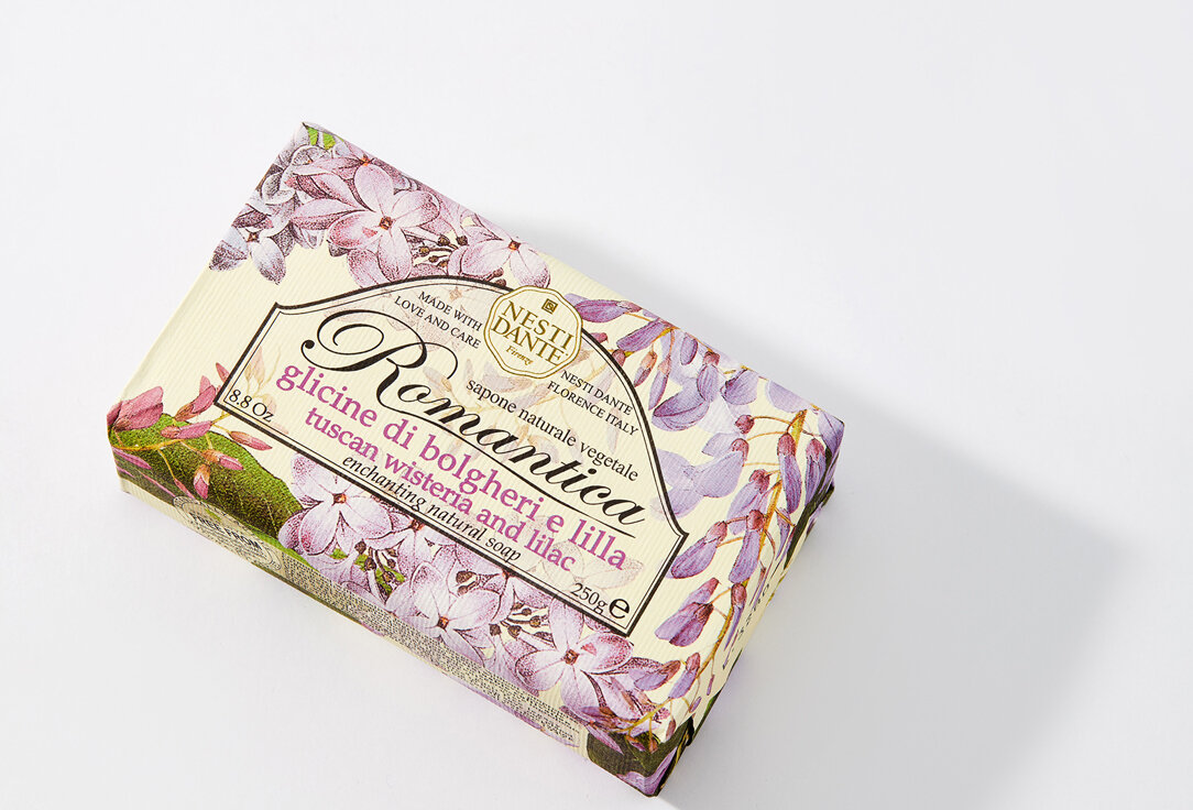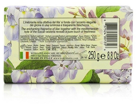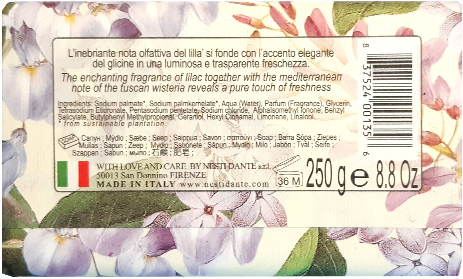 Nesti Dante — экологически чистое мыло, обогащенное растительными экстрактами и маслами. Производится во Флоренции с 1947 года по старинной котловой технологии варки мыла. Не содержит вредных поверхностно-активных веществ, сульфатов, парабенов, синтетических масел и искусственных красителей. Без аллергенов и ингредиентов животного происхождения. Мыло не размокает и быстро восстанавливается после длительного контакта с водой.Сложно найти где-то еще такие поля цветов, как в Тоскане. Они будто шелковистые ковры, которые слепят глаза, если смотреть на них безотрывно. Каждый цветок купается в лучах солнца и впитывает его тепло. Nesti Dante приглашает вас на романтические прогулки по цветущим холмам Тосканы.Мыло Tuscan wisteria and lilac (Тосканская глициния и сирень) подарит ощущение солнечной весны, утопающей в пушистой сирени и длинных кистях глицинии ниспадающих сиреневым сладким дождем, с зелеными, акватическими и розовыми оттенками. Внимание! в аромате нет выраженной ноты сирени.