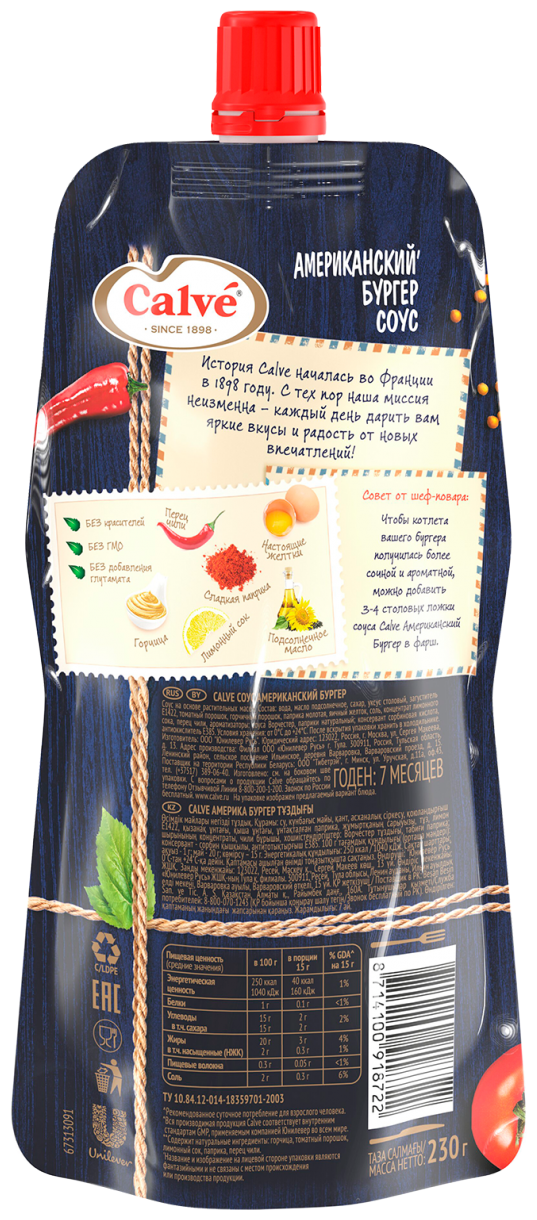 Если вы планируете приготовить бургеры или сэндвичи, то не забудьте про «Американский бургер» соус Calve. Созданный в лучших традициях, с добавлением настоящих желтков, сладкой паприки, перца чили, горчицы и лимонного сока, он обязательно понравится вам и вашим гостям.