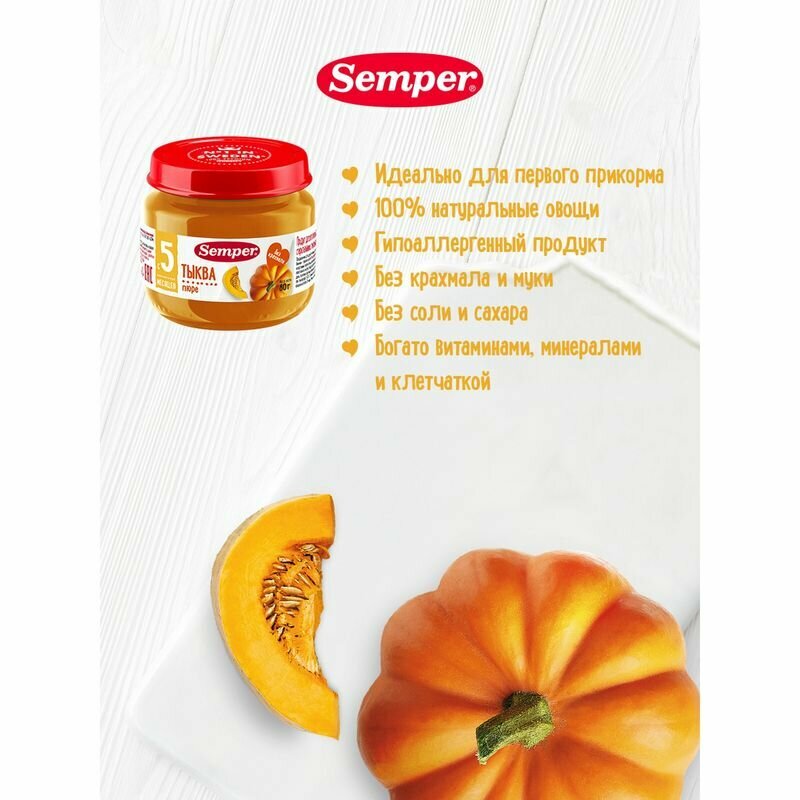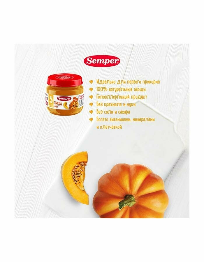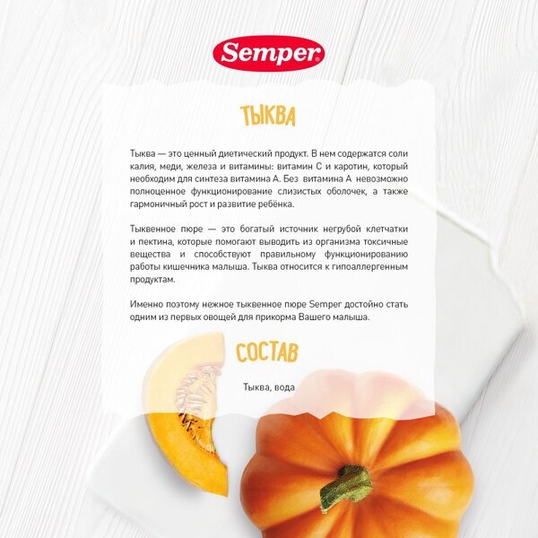 Тыква – это ценный диетический продукт, который практически не вызывает аллергию. Именно поэтому нежное тыквенное пюре от Semper может стать одним из первых овощей для прикорма малыша. В нём содержатся соли калия, меди, железа, витамины, в том числе витамин С, и достаточно много каротина, который необходим для синтеза витамина А, для нормального функционирования слизистых оболочек, а также гармоничного роста и развития. Тыквенное пюре – это богатый источник негрубой клетчатки, пектина, который помогает выводить из организма токсичные вещества и способствует правильному функционированию работы кишечника малыша.