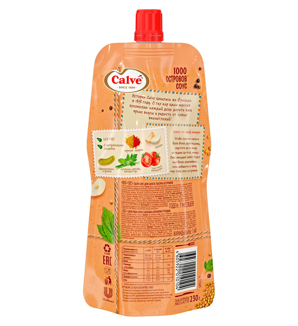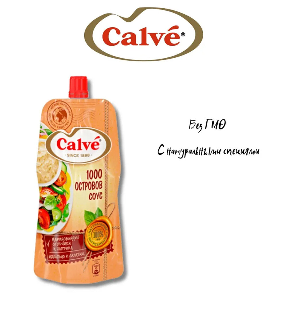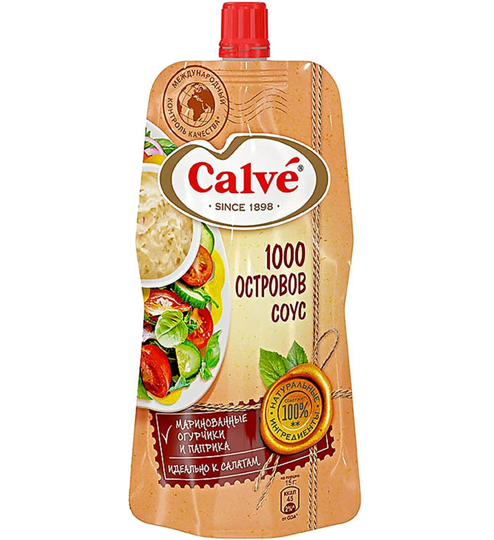 В этот раз Calve привез классический рецепт соуса «Тысяча островов», которым заправляют салаты во всем мире. Добавьте этот пикантный соус с маринованными огурчиками и специально подобранными специями к салатам из овощей и морепродуктов.