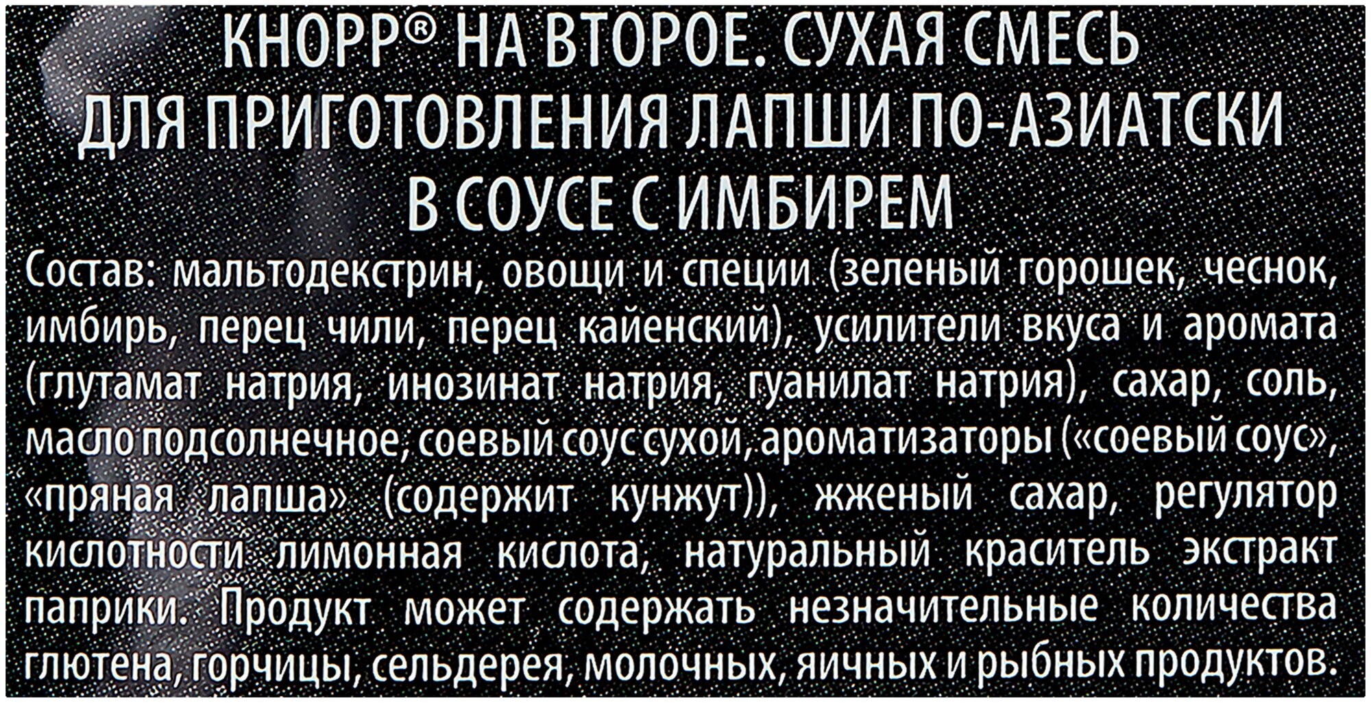 | Состав | мальтодекстрин; овощи и специи (зеленый горошек; чеснок; имбирь; перец чили; перец кайенский); усилители вкуса и аромата (глутамат натрия; инозинат натрия; гуанилат натрия); сахар; соль; масло подсолнечное; соевый соус сухой; ароматизаторы ("соевый соус"; "пряная лапша" (содержит кунжут)); жженый сахар; регулятор кислотности лимонная кислота; натуральный краситель экстракт паприки. Продукт может содержать незначительные количества глютена; горчицы; сельдерея; молочных; яичных и рыбных продуктов |