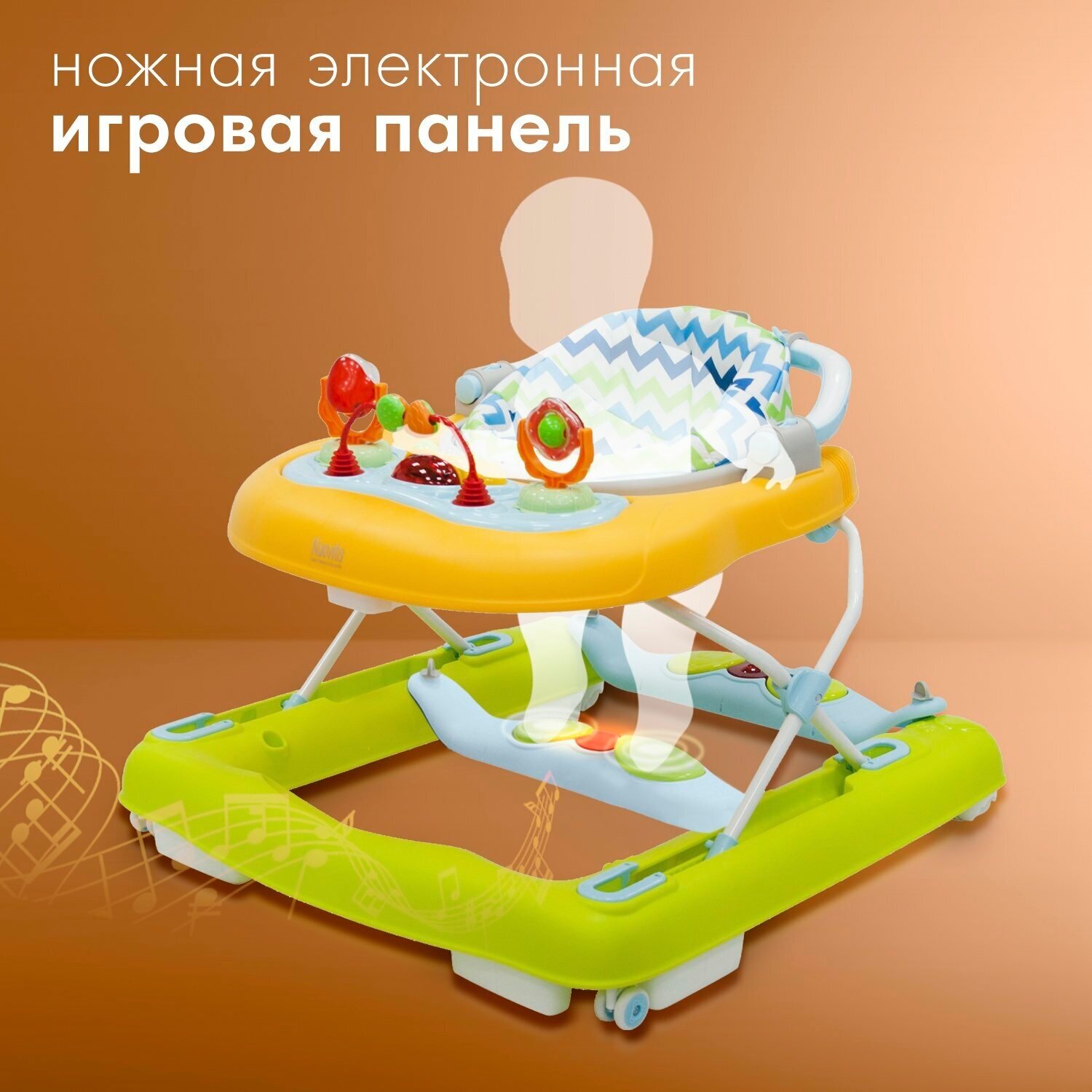 | Особенности | музыкальные эффекты, мягкое сиденье, развивающие игрушки, складная конструкция, съёмная обивка, съемное сиденье, световые эффекты |