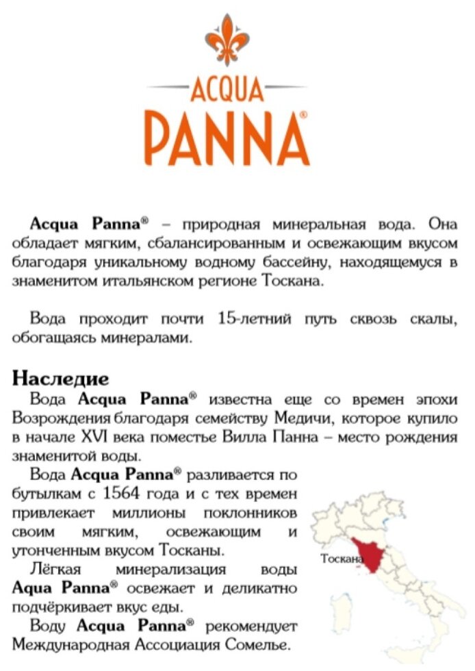 Acqua Panna - природная минеральная вода. Обладает мягким, сбалансированным и освежающим вкусом благодаря уникальному водному бассейну, находящемуся в знаменитом итальянском регионе Тоскана. Легкая минерализация воды Acqua Panna освежает и деликатно подчеркивает вкус еды.