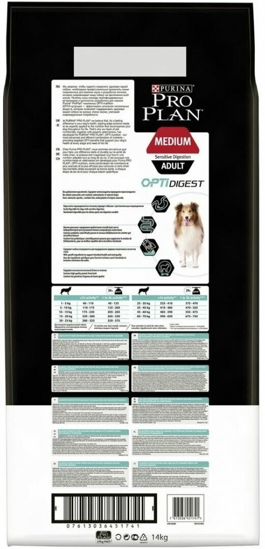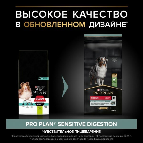 Чувствительное пищеварение - одна из самых часто встречающихся особенностей организма собак, когда они не могут нормально усваивать рацион, не вызывающий проблем у других животных. В результате неправильно подобранного питания у собак могут возникнуть нарушения работы желудочно-кишечного тракта, вздутие живота, диарея, метеоризм. Поэтому для питомцев с чувствительным пищеварением важно подобрать специальный корм, который легко усваивается и переваривается, а также способствует улучшению баланса микрофлоры кишечника.Изучая потребности собак на протяжении многих лет, команда квалифицированных ветеринарных специалистов и диетологов PURINA разработала сухой корм PRO PLAN® Sensitive digestion (для чувствительного пищеварения) — ежедневный рацион с высоким содержанием ягненка для взрослых собак средних пород. Этот полнорационный корм сбалансирован по составу и помогает поддержать здоровое пищеварение.• Содержит пребиотики, способствующие росту бифидобактерий для улучшения баланса микрофлоры кишечника.• Содержит особые ингредиенты для поддержания здоровья кишечника и качества стула.• Помогает поддерживать здоровье суставов при активном образе жизни.Рационы PRO PLAN® разработаны на основе современных научных достижений и рекомендованы ветеринарными специалистами*.Ингредиенты № 1 в рационах PRO PLAN® для собак — это всегда высококачественные кусочки ягненка, лосося, курицы и говядины, приготовленные таким образом, чтобы сохранить вкус и важнейшие питательные вещества.Московская ветеринарная академия им. К. И. Скрябина признаёт экспертизу компании «Нестле» в области кормления домашних животных.Корм сухой для взрослых собак средних пород PRO PLAN® Sensitive digestion (для чувствительного пищеварения) — это полюбившийся PRO PLAN® Opti Digest (Опти Дайджест) с новым названием, но с прежним составом и качеством.