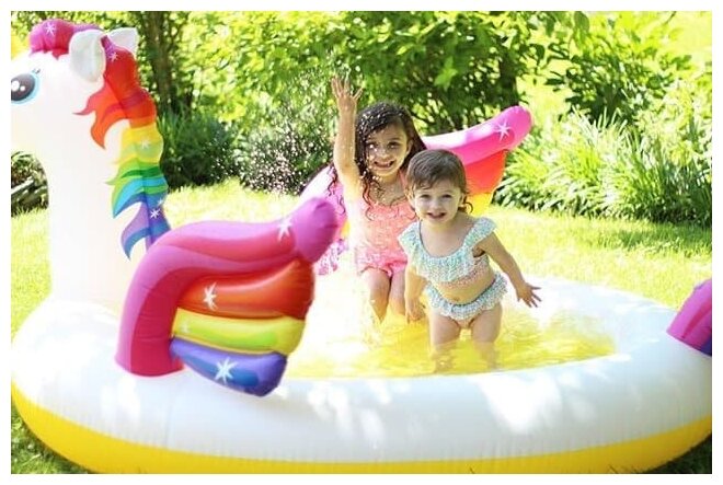 Детский надувной бассейн “Волшебный единорог” с распылителем – надежный, устойчивый, абсолютно безопасный и гипоаллергенный для здоровья. Имеет яркую расцветку, оригинальный дизайн с изображением единорога, мягкие и широкие бортики.