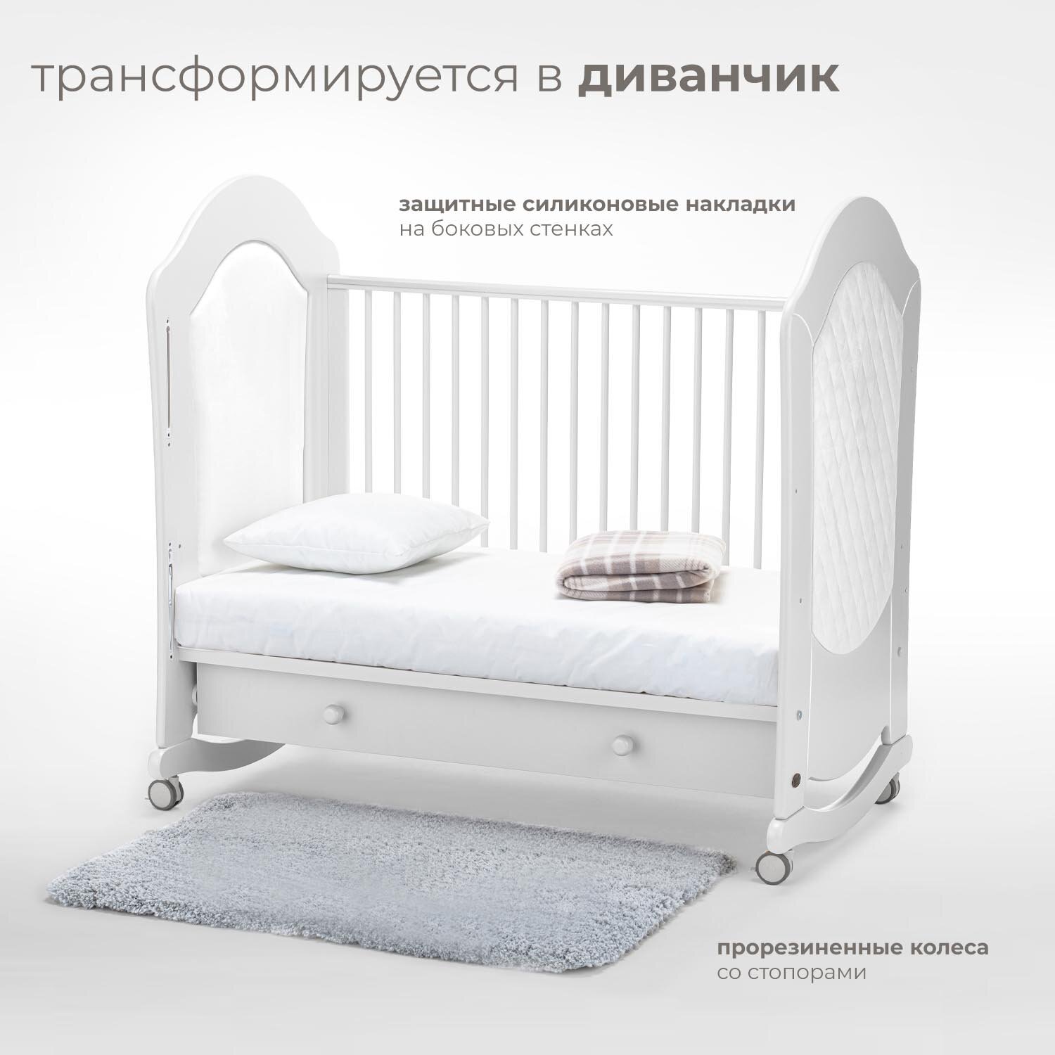 Размер спального места является стандартным для российских кроваток — 120x60см, что позволит без труда подобрать ортопедический матрасик. Перемещение кроватки облегчают колесики, прорезиненная поверхность которых не оставляет следов на напольном покрытии. Для фиксации в неподвижном положении каждое колесо снабжено удобными и прочными стопорами. Наличие просторного ящика облегчает хранение спальных принадлежностей.