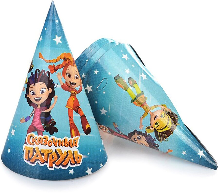 В наборе 6 бумажных колпаков на резинках с ярким, привлекательным принтом.