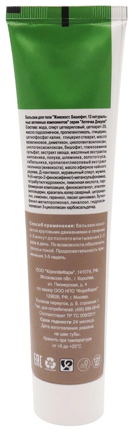 АПТЕЧКА ДИКУЛЯ Живокост Бишофит 12 натуральных активных компонентов бальзам для тела туба 125 мл ООО "КоролёвФарм" (1089041)