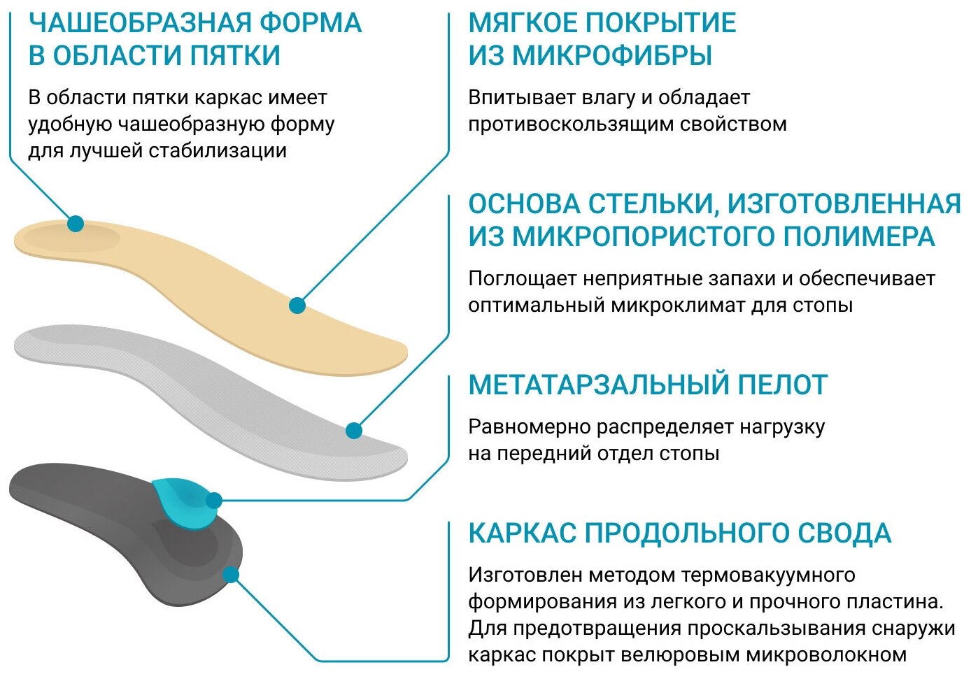 Ортопедические каркасные стельки ORTMANN SUPRA станут незаменимым решением для профилактики и лечения начальных стадий развития плоскостопия и особенно тем, у кого есть «косточка» большого пальца на стопе. Благодаря метатарзальному пелоту данная модель эффективно разгружает передний отдел стопы, что снимает болевые ощущения в области «косточки» большого пальца стопы. Каркас стелек защищает и поддерживает продольный свод и перераспределяет нагрузку на стопу. Основа стельки изготовлена из специального микропористого полимера, который поглощает неприятные запахи. Мягкое покрытие из микрофибры обеспечивает повышенный комфорт и ощущение мягкости при каждом шаге, особенно важно при боли в области «косточки» большого пальца стопы. Показания к применению: Профилактика развития плоскостопия; Продольное плоскостопие 1-2 степени; Комбинированное плоскостопие 1-2 степени; Распластанность переднего отдела стоп 1-2 степени; Беременность; Длительное пребывание на ногах; Тяжелые физические нагрузки; Варикозное расширение вен нижних конечностей; Заболевания позвоночника и суставов ног. Оказываемые стельками эффекты: Хорошо поддерживают поперечный и продольный своды стоп; Повышают устойчивость при стоянии и ходьбе; Перераспределяют нагрузки по всей площади стопы; Сохраняют ноги в тепле; Снимают ударную нагрузку с пятки; Улучшают кровообращение стоп; Предупреждают усталость ног; Предупреждают развитие патологических состояний опорно-двигательной системы; Уменьшают нагрузку на позвоночник, тазобедренные, коленные и голеностопные суставы; Улучшают общее самочувствие. Преимущества и особенности стелек ORTMANN SUPRA: Мягкое покрытие из микрофибры обеспечивает повышенный комфорт и ощущение мягкости при каждом шаге, уменьшая боевые ощущения в области «косточки» большого пальца стопы. Специальный амортизатор в пяточной области снижает ударную нагрузку, уменьшая нагрузку на позвоночник, тазобедренные, коленные и голеностопные суставы; Основа стельки изготовлена из специального микропористого полимера, который поглощает неприятные запахи, обеспечивая комфорт ваших стоп; Метатарзальный пелот равномерно распределяет нагрузку переднего отдела стопы, уменьшая болевые ощущения в стопе; Каркас защищает и поддерживает продольный свод и перераспределяет нагрузку на стопу, предупреждая развитие заболеваний опорно-двигательной системы. Состав: микрофибра; микропористый полимер; пластиковый каркас. Комплектность: 1 пара в упаковке. Противопоказания к применению: Индивидуальная непереносимость материалов; Возможные последствия при использовании товара не по назначению не выявлены. По истечении срока службы товар не представляет опасности для потребителя и может быть утилизирован. Показания по уходу: протирать влажной салфеткой с использованием слабого спиртового раствора; сушить вдали от нагревательных приборов; хранить изделие в сухом и чистом месте; не подвергать изделие высокой температуре, влажности и пыли, оберегать от .