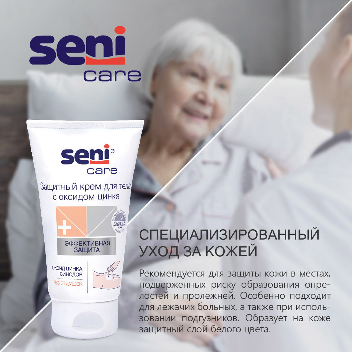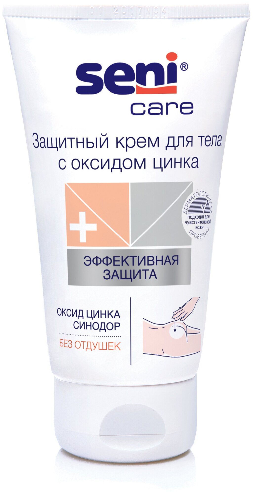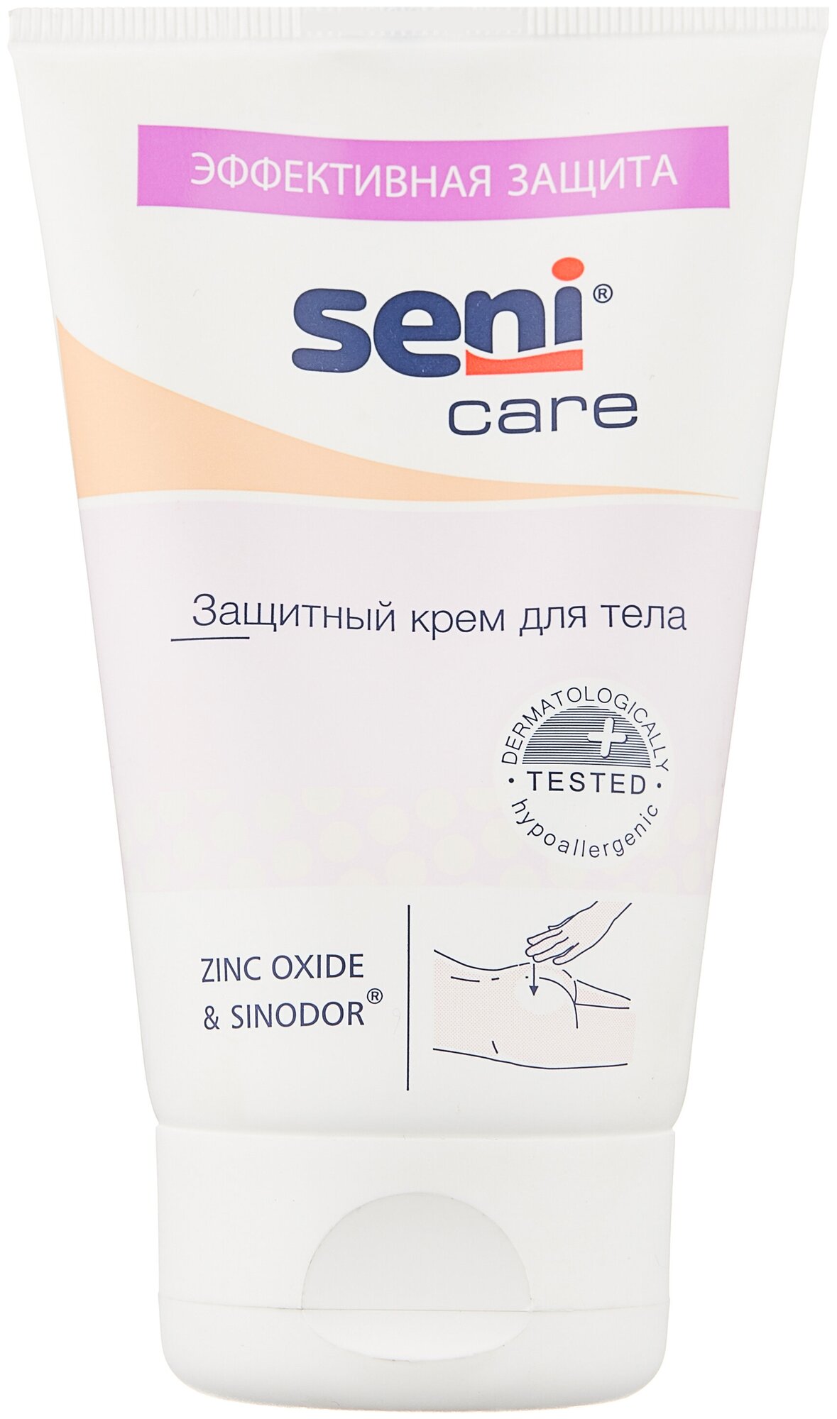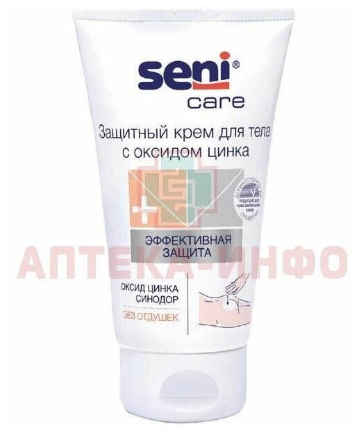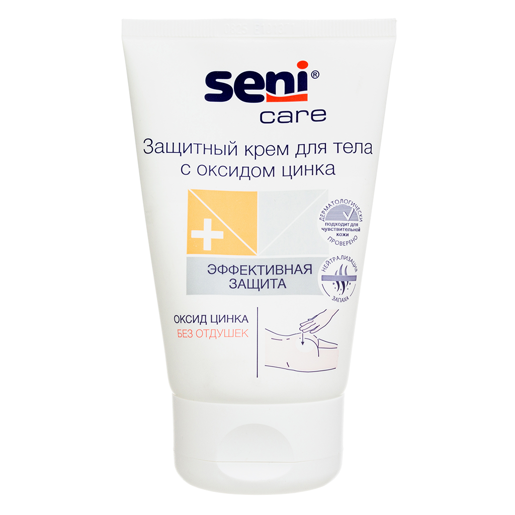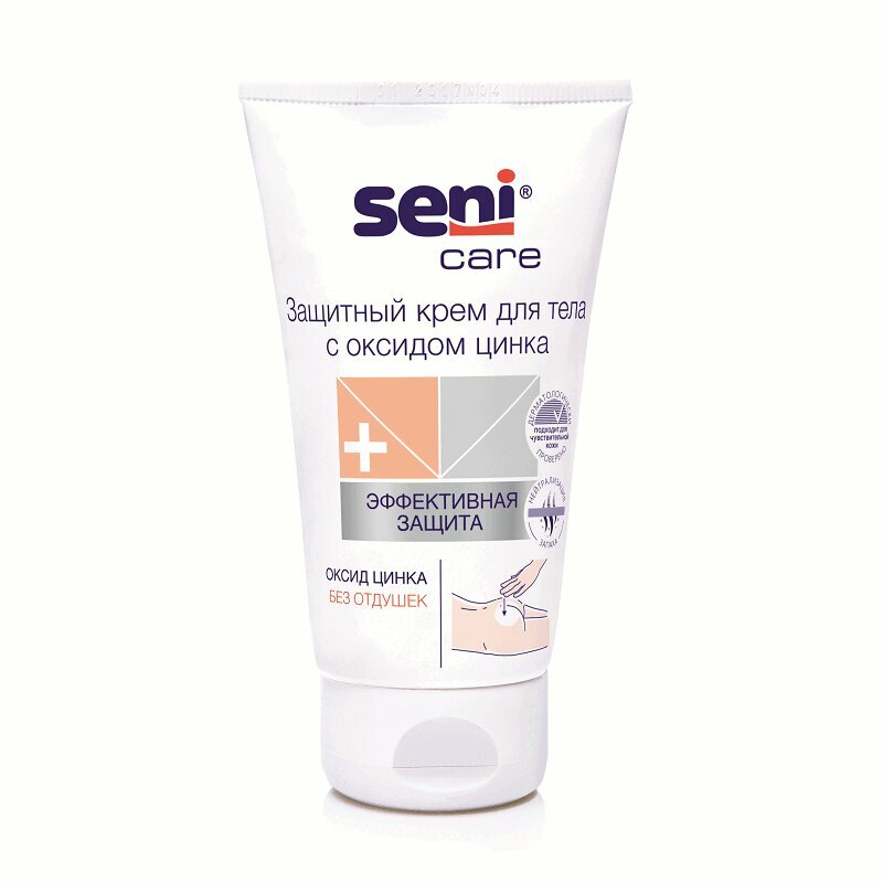 Крем Seni Care с оксидом цинка предназначен для защиты кожи тела в местах, подверженных риску образования опрелостей и пролежней. После нанесения не впитывается подгузником и остается на коже в качестве защитного слоя белого цвета. Крем питает и увлажняет кожу, способствуя ее быстрому восстановлению. Рекомендуется для защиты кожи в местах, подверженных риску образования опрелостей и пролежней. Особенно подходит для лежачих больных, а также при использовании подгузников - в этих случаях кожа нуждается в особом уходе. Не содержит отдушек. Входящий в состав биокомплекс льна питает кожу, пантенол увлажняет, а экстракт ромашки успокаивает ее. Благодаря оптимальному содержанию оксида цинка крем защищает кожу от появления раздражения. Содержит нейтрализатор запаха - средство, поглощающее неприятный запах мочи. После нанесения не впитывается подгузником и остается на коже в качестве защитного слоя белого цвета.