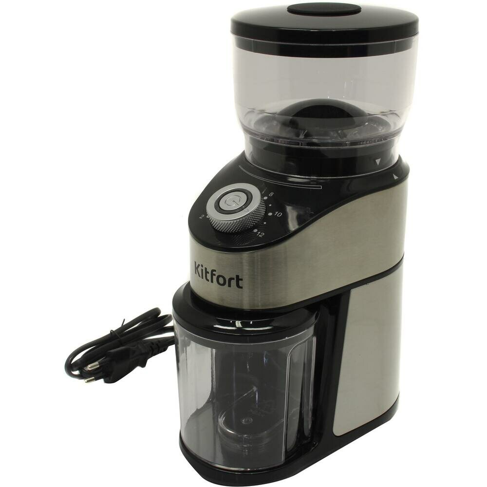 Kitfort Кофемолка предназначена для помола кофейных зёрен, оснащена коническими жерновами из углеродистой стали. Особенности: Зерно, попадая между жерновами, быстро перемалывается, продвигаясь вниз, поэтому кофе не перегревается и не меняет свой вкус. Вы можете выбрать, какое количество зёрен требуется намолоть за один раз: от 2 до 12 чашек. Кофемолка намелет нужное количество и автоматически отключится. Жерновая кофемолка даёт равномерный помол и позволяет настроить его степень: от мелкого для эспрессо кофеварки до крупного для френч-пресса. При неравномерном помоле вкус заваренного кофе портится. Контейнеры для молотого кофе и для зёрен съёмные. Внешний жернов также съёмный для удобства очистки. Для чистки жерновов в комплекте с кофемолкой идёт маленькая щёточка.