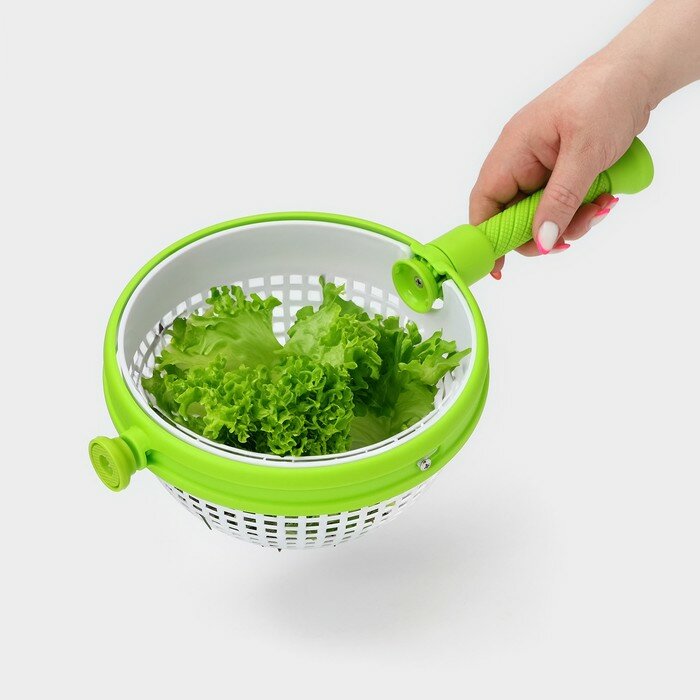 Сушка для салата и зелени предназначена для быстрой и тщательной сушки свежевымытого салата, трав, зелени, фруктов, грибов и ягод, а также для перемешивания, сервировки и хранения готовых салатов. Использование этого кухонного помощника удалит излишнюю влагу, сохраняя форму и " пышность" салата. Сушка состоит из внешнего контейнера и внутренней корзины, стенки и дно которой не граничат с корпусом контейнера, сохраняя место для слива воды. Сама сушка с легкостью разбирается на составные части. Устройство очень просто и удобно в использовании: поместите в корзину только что вымытую зелень или другие продукты и начните вращение с помощью ручки на верхней крышке. Механизм, принуждающий дуршлаг вертеться, создаст эффект центрифуги, избавляя ягоды и зелень от излишней влаги. Во время вращения вся лишняя влага осядет на дне внешнего контейнера. Всего несколько секунд, и зелень готова к употреблению. Весь процесс сушки займет не более минуты. При желании пластиковый контейнер можно использовать отдельно, без корзины и крышки, для сервировки или хранения салатов. Сушка легко разбирается и собирается, поэтому её удобно хранить на кухне и в любом шкафу. Изготовлена из долговечного прочного пластика. Подходит для мытья в посудомоечной машине в режиме деликатной мойки. Размеры: 20.5*20.5*12 см.