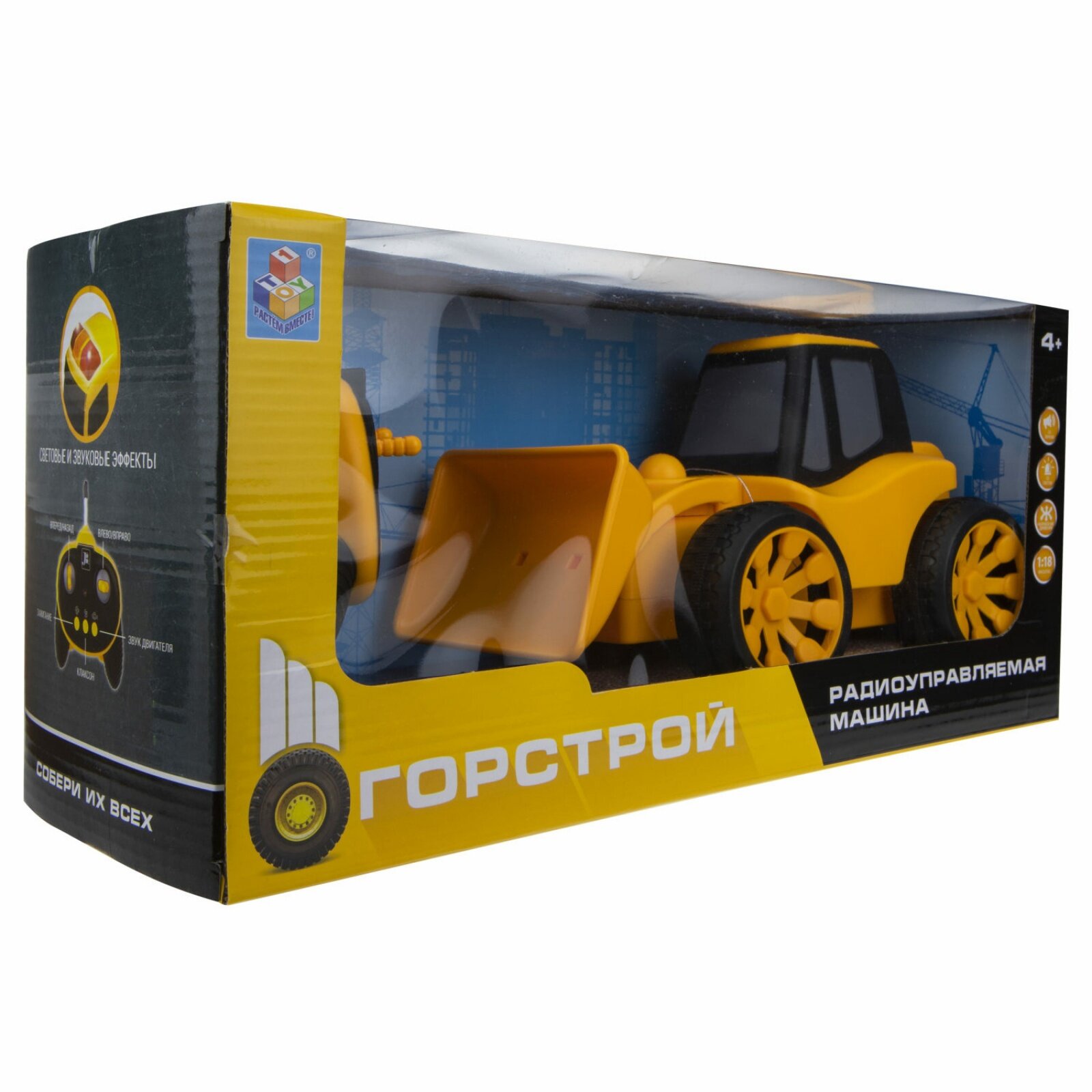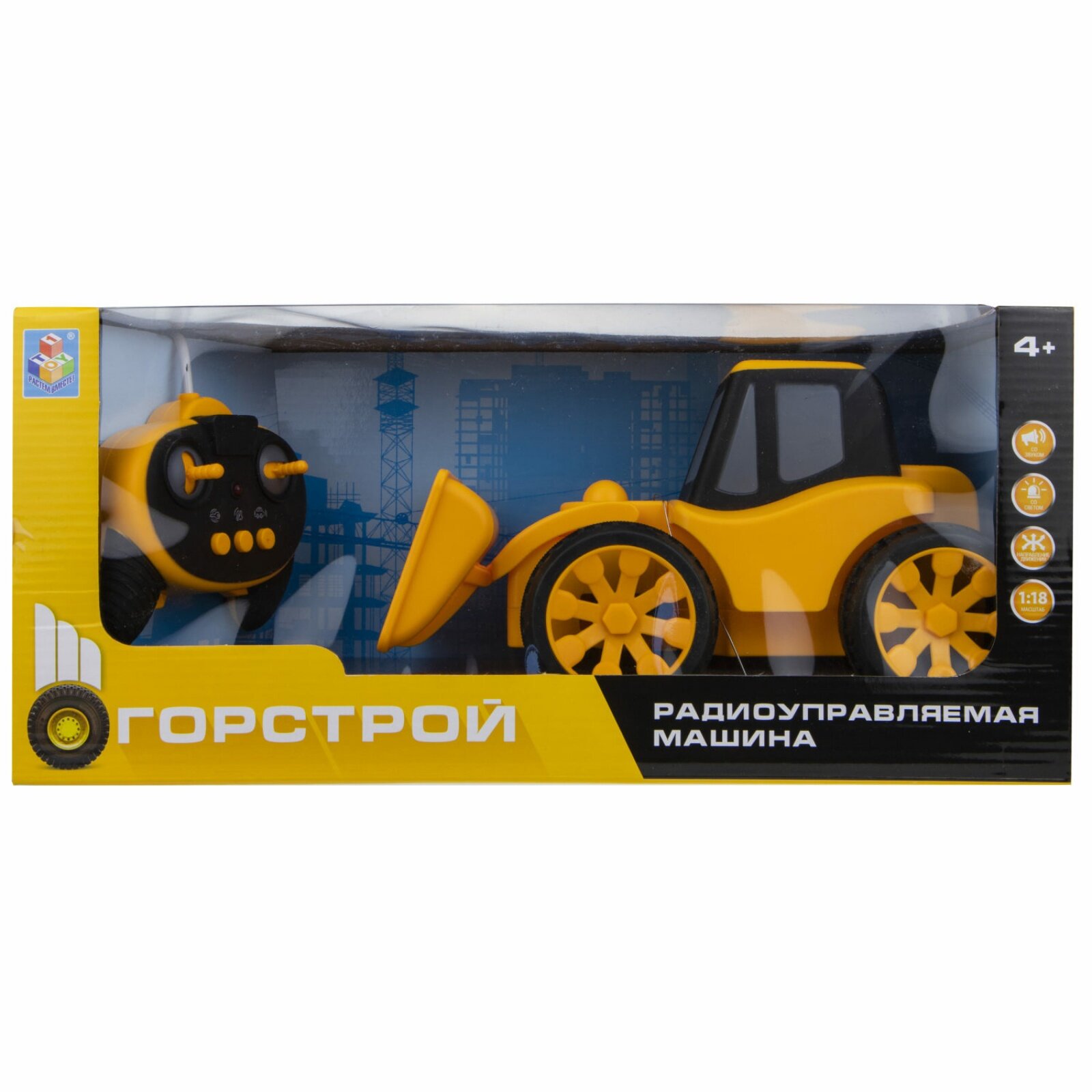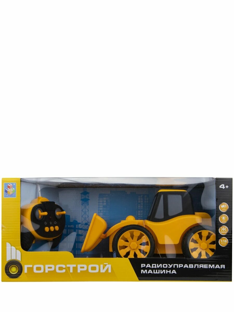 "Горстрой" - модели строительной техники с пультом дистанционного управления в комплекте. Реалистичные звуковые эффекты: звук запуска двигателя и клаксона. Световые эффекты. Движение во всех направлениях. Масштаб 1:18. Работает от батареек.