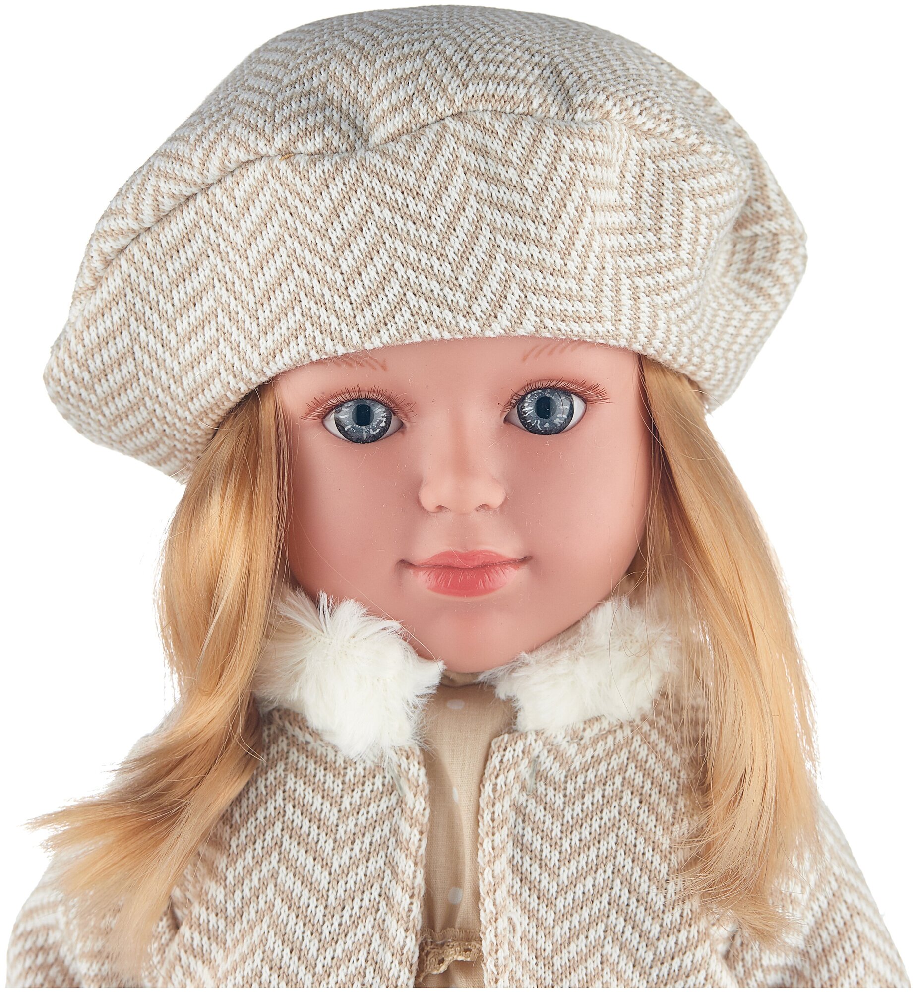 Эта модница похожа на коренную француженку, а в ее наряде и грации проглядывается определенный стиль и умение себя подать. Если ваша дочка ценит красивые, качественные и нетиповые игрушки, то с такой куклой вы не прогадаете в подарке, а преподнесете ребенку приятный сюрприз.Особенности: – Данная кукла предназначена для девочек старше 3 лет.– Она представляет собой очаровательную малышку с детально проработанной внешностью, которая похожа на здоровую и жизнерадостную девочку.– У куклы тщательно проработанное личико, которое делает ее похожей на настоящего ребенка, а также присутствуют характерные складочки на теле, выразительные голубые глаза и переливающие волосы натурального русого цвета.– Кукла одета в красивый наряд, выполненный в бело-бежевой цветовой гамме. На ней колготки с рисунком и стильный берет, платье в горох с воротником-стойкой и кружевной отделкой на талии и подоле, пальто с мехом на манжетах и воротнике, а также бежевые туфельки.– Тело куклы мягконабивное, а благодаря особому, жесткому, пластиковому каркасу она может стоять. Конечности игрушки изготовлены из качественного винила и являются подвижными, поэтому игра с ней будет особенно реалистичной– Высота игрушки равна 49 см, поэтому она подойдет не только для игры в дочки-матери, но и справится с ролью сестренки или подружки.– Во время игры ребенок сможет представить себя в роли мамы, потренироваться в проявлении заботы и внимания, а также придумать веселую игру.