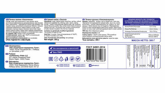 | Состав | сахар, мука пшеничная в/с, мука овсяная, масла растительные рафинированные дезодорированные, вода питьевая, изюм, разрыхлитель – гидрокарбонат натрия (сода пищевая), соль поваренная пищевая, корица, ароматизатор натуральный «ваниль» |