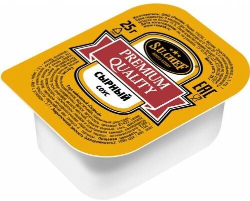 Соус сырный порционный 120шт*25мл . Состав: Масло подсолнечное, вода питьевая, пшеничный декстрин, желток яичный, концентрат сывороточных белков, загуститель: крахмал Е1422, сахар, бета-каротин, аннато, ароматизатор, стабилизаторы: гуаровая и ксантановая камеди, консерванты: сорбат калия и бензоат натрия, эмульсия вкусоароматическая "Красный перец", антиокислитель Е385. На предприятии используются продукты переработки сои, кунжута и горчицы.Срок годности 180 суток.