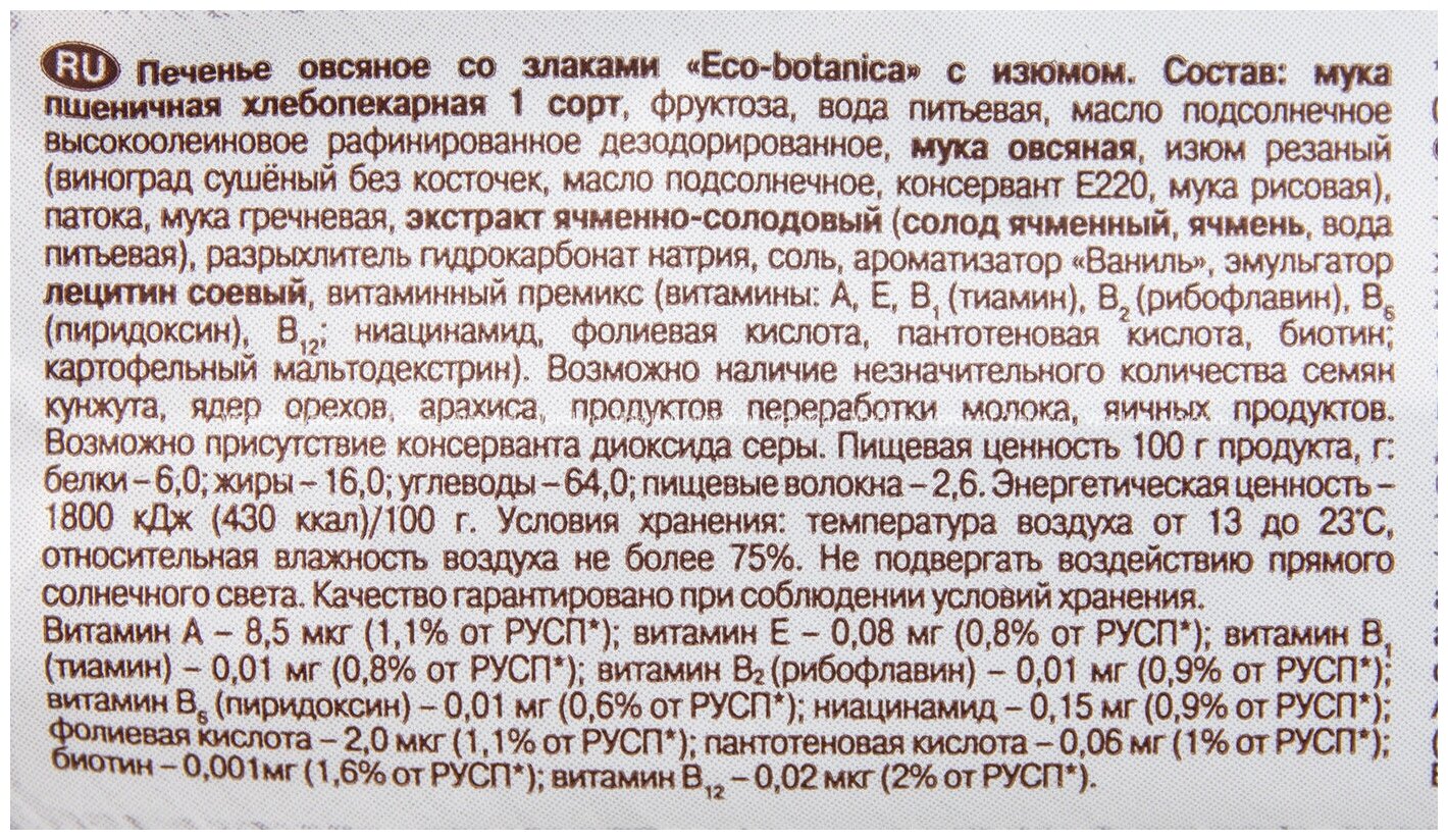 | Состав | мука пшеничная хлебопекарная 1 сорт, фруктоза, вода питьевая, масло подсолнечное высокоолеиновое рафинированное дезодорированное, мука овсяная, изюм резаный (виноград сушеный без косточек, масло подсолнечное, консервант е220, мука рисовая), патока, мука гречневая, экстракт ячменно-солодовый (солод ячменный, ячмень, вода питьевая), разрыхлитель гидрокарбонат натрия, соль, ароматизатор ваниль, эмульгатор лецитин соевый, витаминный премикс (витамины а, е, в1 (тиамин), в2 (рибофлавин), в6 (пиридоксин), в12, ниацинамид, фолиевая кислота, пантотеновая кислота, биотин, картофельный мальтодекстрин |