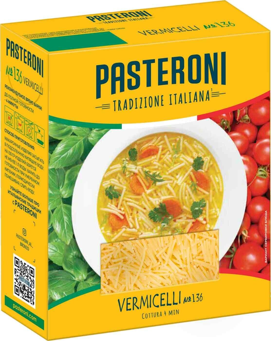 Паста №136 Pasteroni - это вермишель из твердых сортов пшеницы. Тесто для приготовления изделий замешивается на холодной воде, поэтому они получаются упругими. Вермишель быстро готовится. При соблюдении рекомендованного времени варки она сохраняет свою форму и не разваливается. Вермишель отлично подходит для супов. Также изделия используются в качестве самостоятельного гарнира, создания тушеных блюд и даже салатов. 100% натурально. Варить до полной готовности 4 минуты.