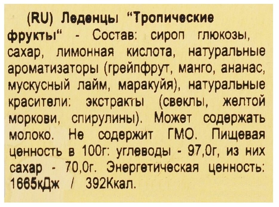 | Состав | глюкозный сироп; сахар; смесь концентратов фруктовых соков (1%) (ананас, маракуйя, мандарин, манго, грейпфрут); регулятор кислотности лимонная кислота; смесь экстрактов (желтой моркови, свеклы); ароматизатор |