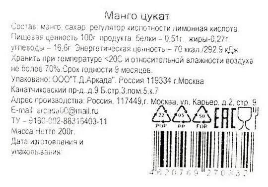 | Состав | манго сушеное, регулятор кислотности лимонная кислота, Е 220 |