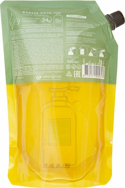 Жидкое мыло Olea Urban, 450 млописание Защищает от внешнего воздействия. Обеспечивает длительное увлажнение. Морские водоросли стимулируют регенирацию кожи, защищают от повреждений свободными радикалами, повышают упругость и тонус кожи. Формируют естественный био-барьер. Гиалуроновая кислота обеспечивает увлажнение в течении 24 часов, предупреждая обесвоживание, помогает противостоять вредным стресс-факторам.