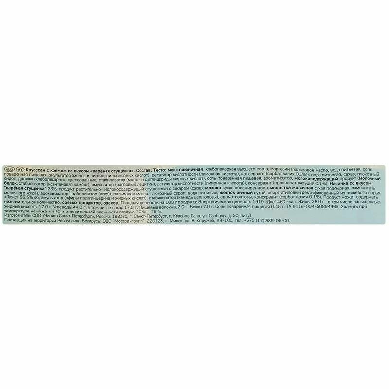 Состав: мука пшеничная хлебопекарная высшего сорта, вода питьевая, маргарин (пальмовое масло, вода питьевая, соль поваренная пищевая, эмульгатор (моно- и диглицериды жирных кислот), регулятор кислотности (лимонная кислота), консервант (сорбат калия 0.1%)), сахар, стабилизатор (моно- и диглицериды жирных кислот), дрожжи хлебопекарные прессованные, соль поваренная пищевая, ароматизатор, молокосодержащий продукт (молочный белок, стабилизатор (ксантановая камедь), эмульгатор (рапсовый лецитин), регулятор кислотности (лимонная кислота)), консервант (пропионат кальция 0.1%). начинка со вкусом вареная сгущенка 34%: продукт растительно-молокосодержащий сгущенный с сахаром (сахар, молоко сухое обезжиренное, сыворотка молочная сухая подсырная, заменитель молочного жира, ароматизатор, стабилизатор (агар)), пальмовое масло, глюкозный сироп, вода питьевая, желток яичный сухой, спирт этиловый ректификованный из пищевого сырья люкс 96.3%, эмульгатор (эфиры полиглицерина и жирных кислот), консервант (сорбат калия 0.1%). Продукт может содержать незначительное количество: яичных продуктов, соевых продуктов, орехов