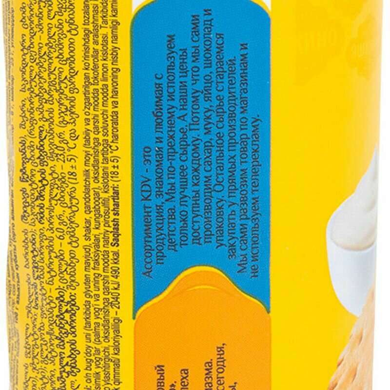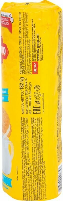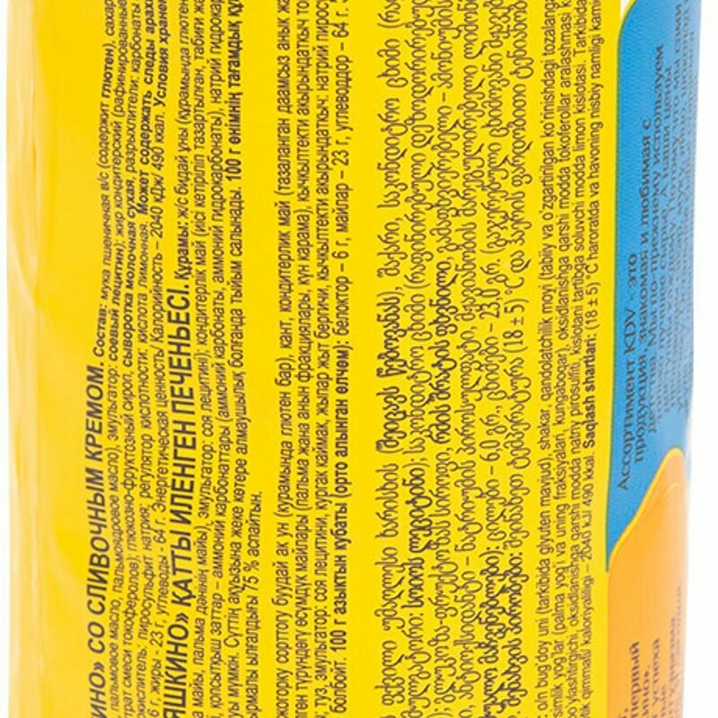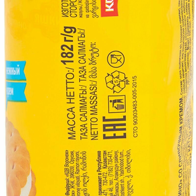 Состав: Мука пшеничная высшего сорта, сахар, жир кондитерский (рафинированные дезодорированные растительные масла в натуральном и модифицированном виде (фракции пальмового масла, пальмовое масло, пальмоядровое масло), эмульгатор лецитин соевый), жир кондитерский (рафинированные дезодорированные растительные масла в натуральном и модифицированном виде, эмульгаторы (моно-и диглицириды жирных кислот, соевый лецитин), ароматизатор, краситель бета-каротин, антиокислители (аскорбиновая кислота, альфа-токоферол)), вода, сыворотка молочная сухая, разрыхлители (гидрокарбонат аммония, гидрокарбонат натрия), соль, сливки сухие, эмульгатор лецитин соевый, ароматизатор, антиокислитель пиросульфит натрия, регулятор кислотности кислота лимонная.