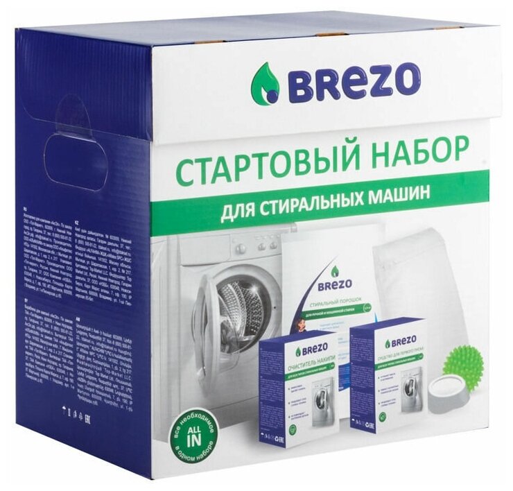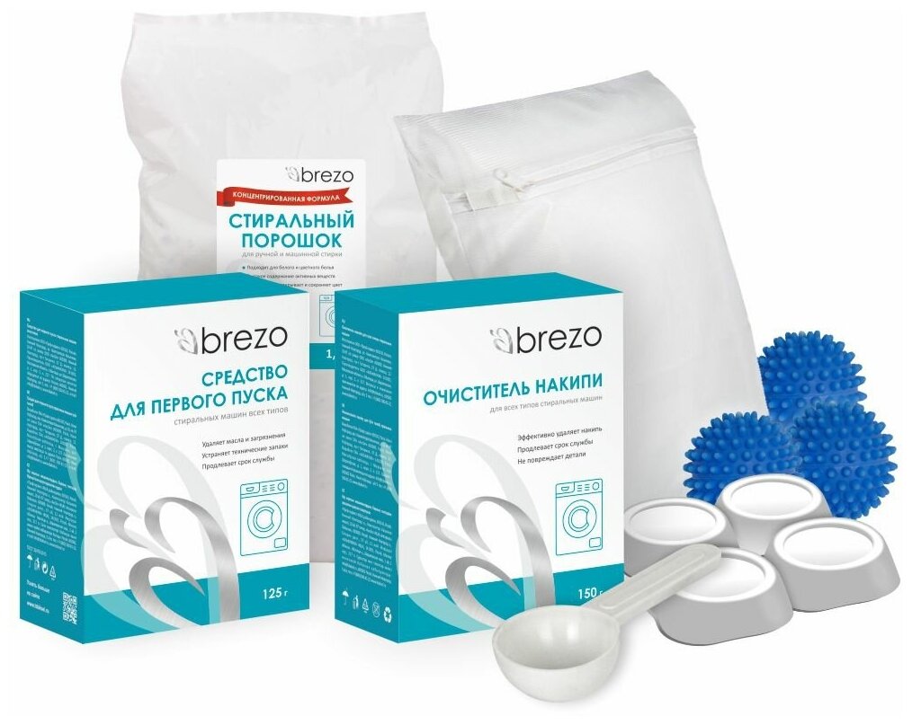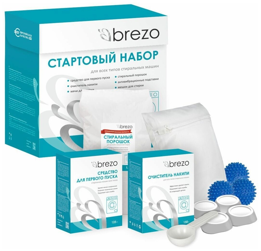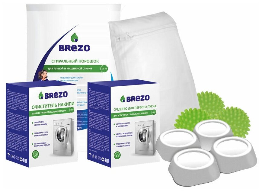 В наборе собрано все, что нужно для успешного ввода в эксплуатацию любых видов стиральных машин: средство для первого пуска, очиститель накипи, стиральный порошок, мячи для стирки, антивибрационные подставки, мешок для стирки.Комплексное использование средств из набора позволяет обеспечить:· эффективный и безопасный первый пуск стиральной машины,· бесперебойную работу нагревательных элементов,· профилактику появления известкового налета и накипи,· бережное и качественное устранение загрязнений с различных видов ткани.Внимание! Прежде чем первый раз включать новую стиральную машину, внимательно изучите инструкцию по ее эксплуатации.средство для первого пуска. Очищает барабан стиральной машины от масел, пыли и прочих технических загрязнений, которые есть у новой бытовой техники. Позволяет исключить появление трудновыводимых пятен и неприятных запахов на белье во время первой стирки. Защищает нагревательные элементы от образования накипи при дальнейшем использовании, позво