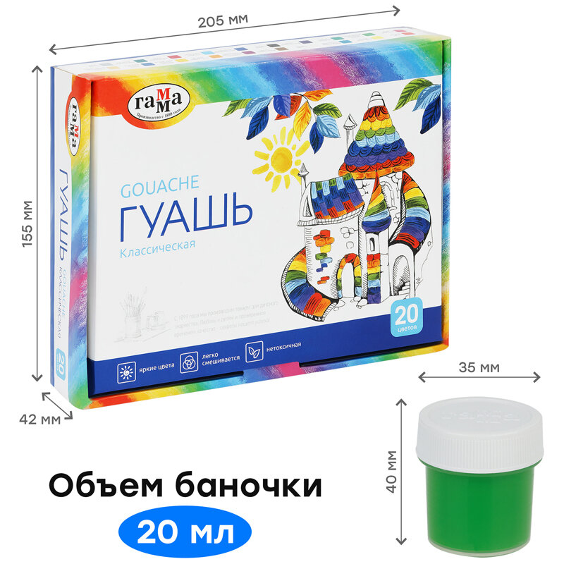 Гамма Гуашь Классическая 20 цветов 20 мл подходят для детей школьного возраста от 7 до 12 лет. Обладают плотной, непрозрачной текстурой и высокой укрывистостью. Гуашь производится на основе качественного, прозрачного связующего вещества, чтобы сохранить чистоту цветов. Она хорошо смешивается, рисует практически на любой поверхности, а при высыхании даёт бархатистый матовый эффект. Гуашь представлена в картонных упаковках с приятным на ощупь soft-touch покрытием. Особенности: Набор: 20 цветов в баночках. Объем баночки - 20 мл.