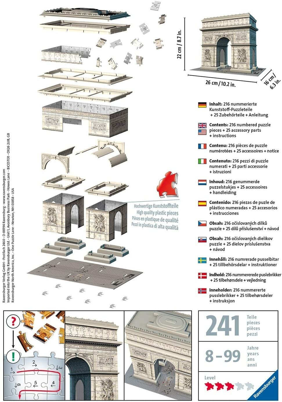 Триумфальная арка - архитектурный памятник, представляющий собой большую торжественно оформленную арку. Триумфальные арки устраиваются при входе в города, в конце улиц, на мостах, на больших дорогах в честь победителей или в память важных событий.Создавайте уникальные 3D-конструкции с помощью 3D-пазлов от Ravensburger! Откройте для себя новый 3D-способ решения головоломок.3D пазлы Ravensburger выполнены из пластика — это обеспечивает устойчивость собираемой конструкции, удобство сборки, сохранность и долговечность картинки.Уникальные навесные пластиковые детали соединяются вместе, образуя прочную конструкцию без клея! Чтобы быстро собрать пазл, можно воспользоваться нумерацией на задней части элементов пазла. Пазл может быть использован многократно.Комплектация 3D пазлов включает пластиковые элементы пазла, аксессуары, инструкцию.3D Пазл состоит из 216 элементов.Возраст: 10+Размер упаковки: 6см x 19см x 27см