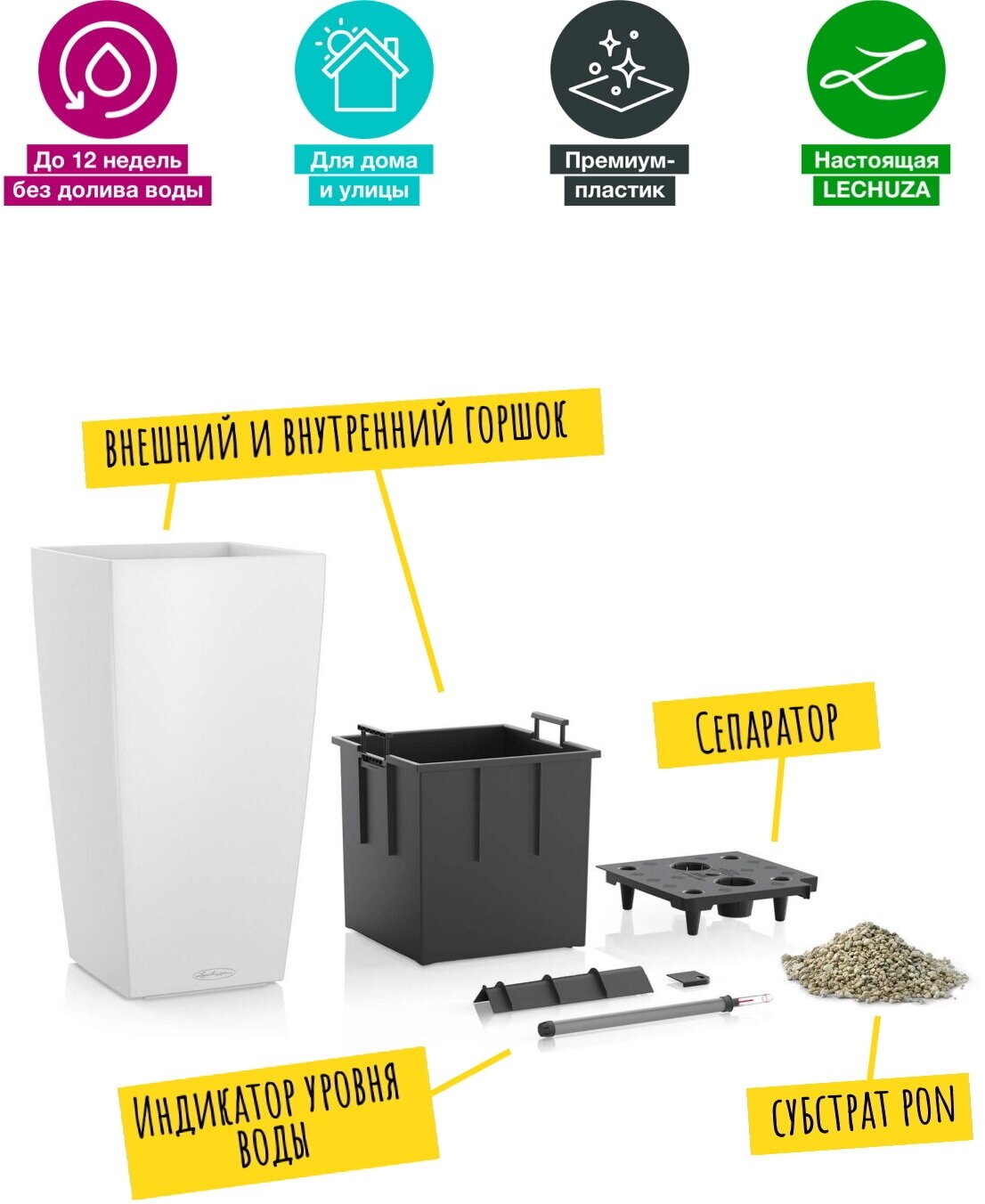 Классическое вытянутое кашпо стандартных размеров Lechuza Complete с системой автополива отличное решение домашнего интерьера для придания уюта, свежести и новизны. Качество и новейшие технологии немецкого производства позволяют кашпо Lechuza Complete сохранять форму, вид и изящность. Кашпо сделано из прочного и высококачественного пластика. Не стоит переживать, что по прошествии лет, кашпо Lechuza Complete изменит цвет или форму. Новейшая технология автополива позволит вашему любимцу сохранять баланс влаги в почве и оставаться здоровым, система автополива будет сама регулировать поступление воды и период пополнения резерва. Размеры кашпо Lechuza Complete стандартны - 30х30х56см и подойдут как для расположения на столе, тумбочки, так и на полу. Классический и традиционный белый цвет поможет внести в интерьер квартиры чувство стиля и шарма, а слегка изогнутая форма таинственности и волшебства.