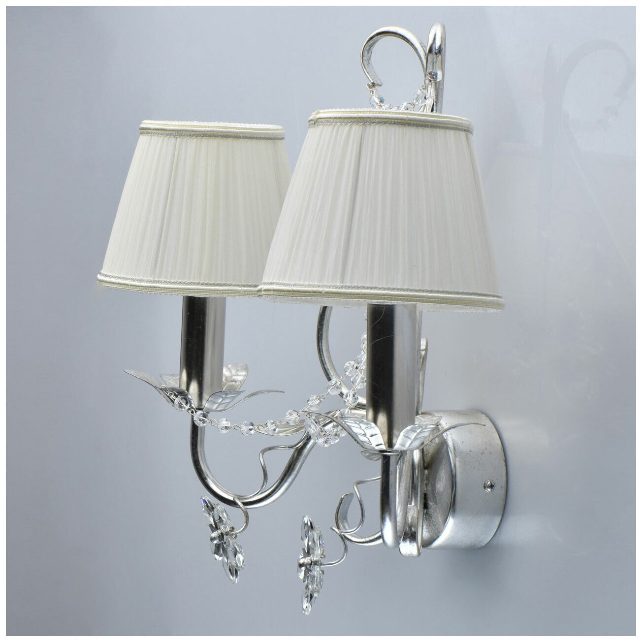 Бра Валенсия — роскошный светильник, выполненный в стиле классического необарокко. Витиеватые металлические детали, покрытые сусальным серебром выглядят внушительно, элегантно. Плиссированные тканевые колпачки возвращают в уютную эпоху, когда в моде был полумрак и мягкий свет. Хрустальные подвески преломляют лучи и дают приятное мерцание. Современное качество и технологии позволят светильнику долгие годы не терять своего презентабельного первоначального вида.