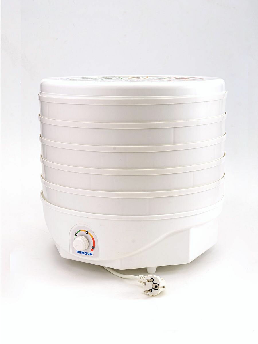 Сушилка для овощей и фруктов Renova используется в домашних условиях. Устройство имеет встроенный нагревательный элемент и вентилятор для своевременного отведения тепла, что препятствует перегреву и обеспечивает безопасность эксплуатации. Корпус модели и поддоны изготовлены из высококачественного пластика с металлическими элементами. Материал устойчив к механическому и термическому воздействию, поэтому не деформируется в течение продолжительного времени. Устройство позволяет высушить ягоды, овощи, фрукты, грибы, лекарственные и душистые травы. Пользователь может регулировать температуру нагрева посредством поворотного переключателя, расположенного на фронтальной панели модели. Поддоны очищаются от загрязнений с помощью мягкой губки и небольшого количества моющего средства. Сушилка для овощей и фруктов Renova подключается к стандартной электросети и потребляет до 500 Вт, что позволяет экономить энергоресурс. Полезный объем сушилки составляет 15л. Этого достаточно для термической обработки большого количества продуктов.