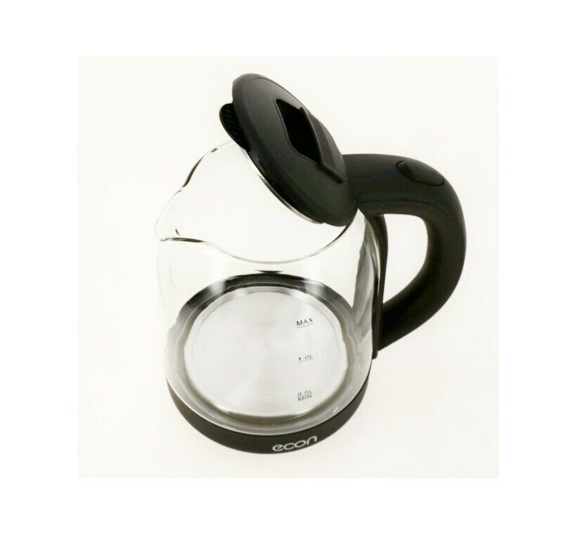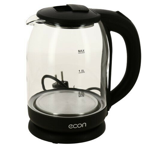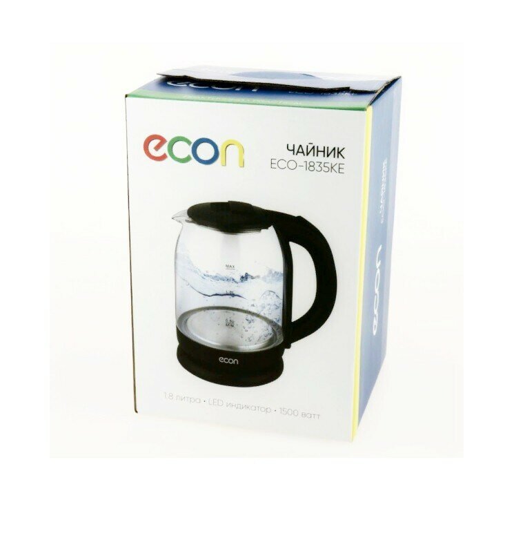 Бюджетный, практичный и стильный электрический чайник Econ из жаропрочного стекла с подсветкой быстро нагреет воду и сам отключится после закипания.