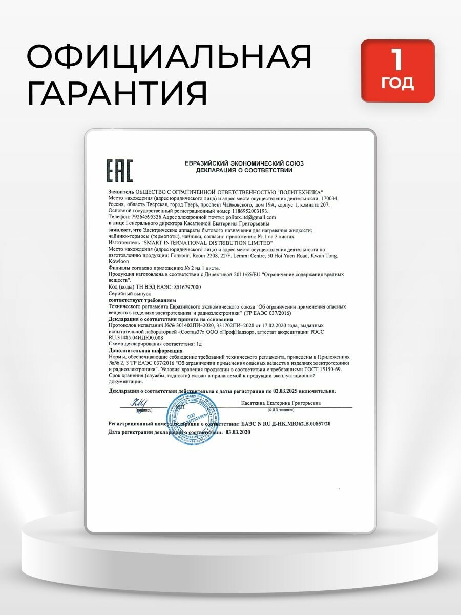 | Комплектация | чайник, гарантийный талон, инструкция на русском языке |